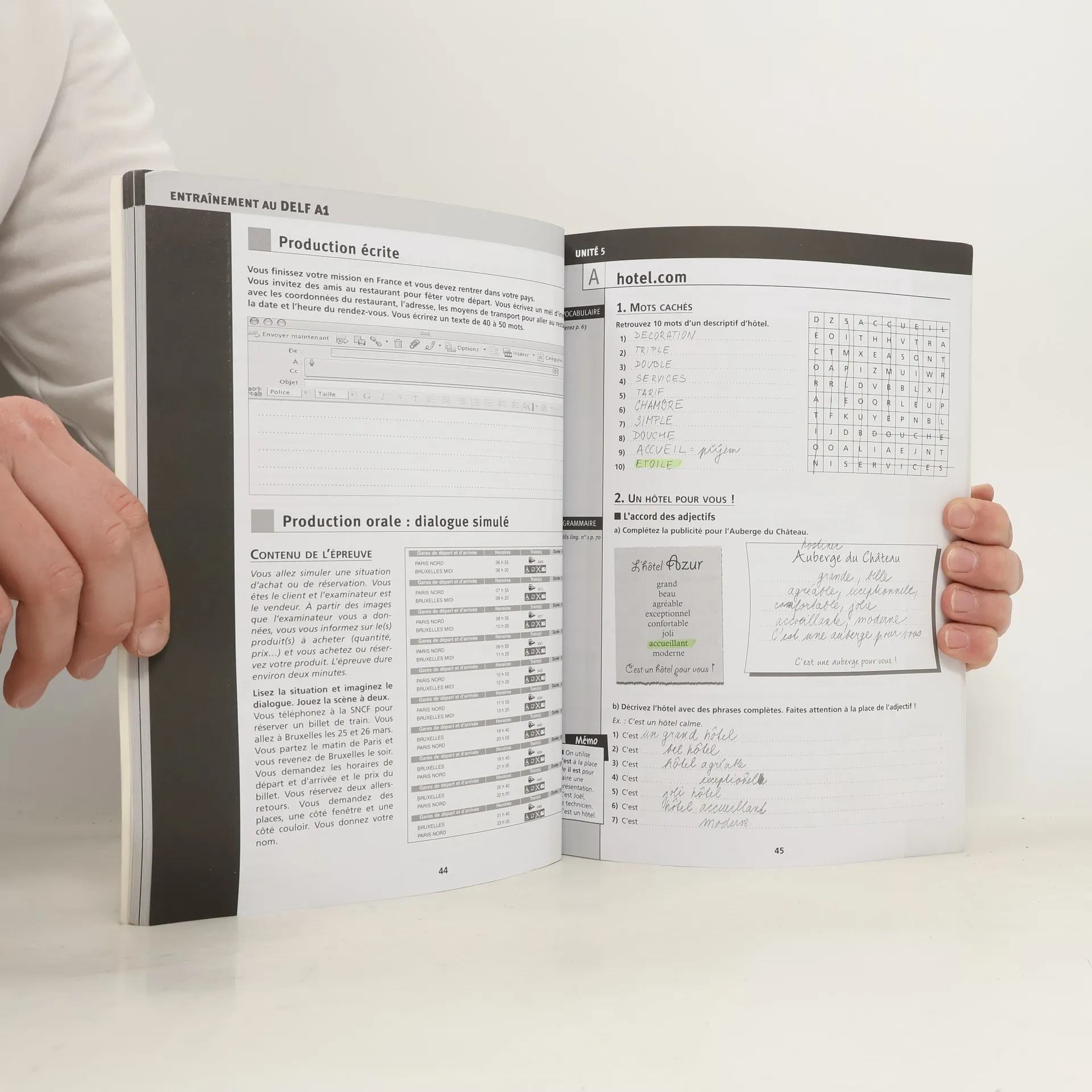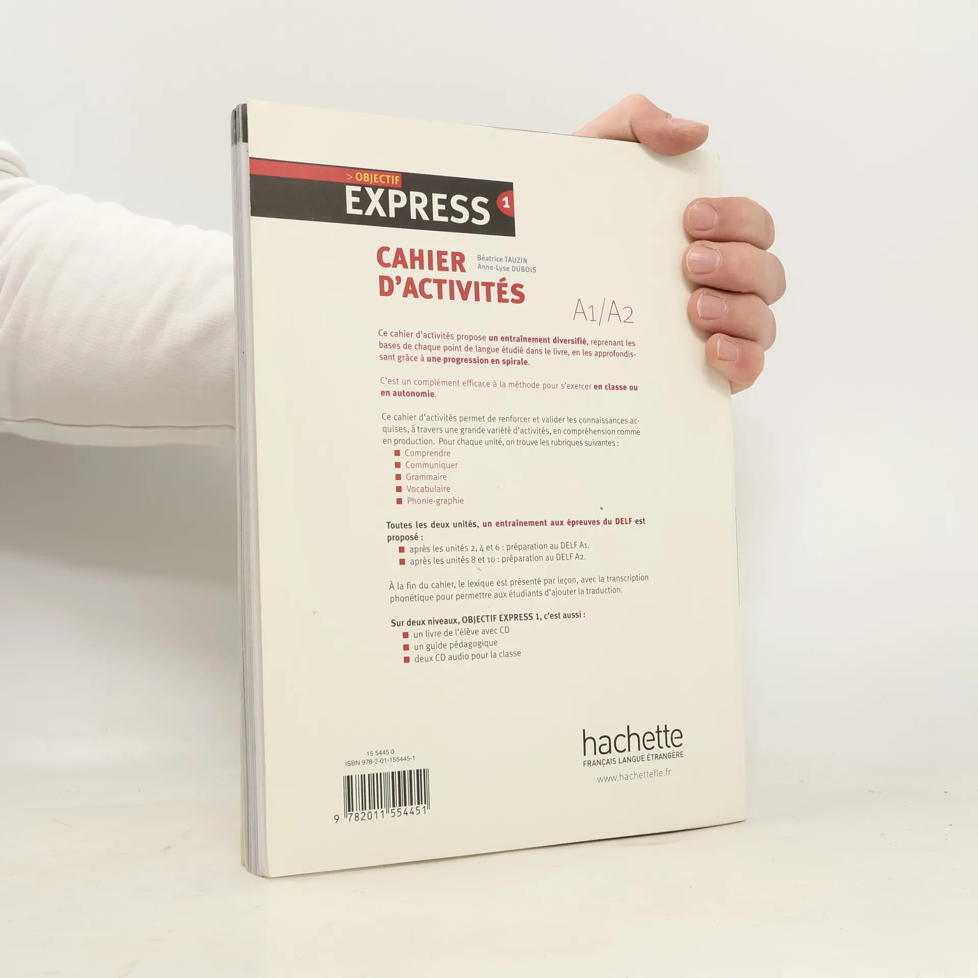Structure :Ce cahier d'activités propose un entraînement diversifié , reprenant les bases de chaque point de langue étudié dans le livre, en les approfondissant grâce à une progression en spirale.C'est un complément efficace à la méthode pour s'exercer en classe ou en autonomie .Ce cahier d'activités permet de renforcer et valider les connaissances acquises, à travers une grande variété d'activités, en compréhension comme en production.Pour chaque unité, on trouve les rubriques - Comprendre- Communiquer- Grammaire- Vocabulaire- Phonie-graphieToutes les deux unités, un entraînement aux épreuves du DELF est proposé- après les unités 2,4 et 6: préparation au DELF A1.- après les unités 8 et 10: préparation au DELF A2.A la fin du cahier, le lexique est présenté par leçon, avec la transcription phonétique pour permettre aux étudiants d'ajouter la traduction.