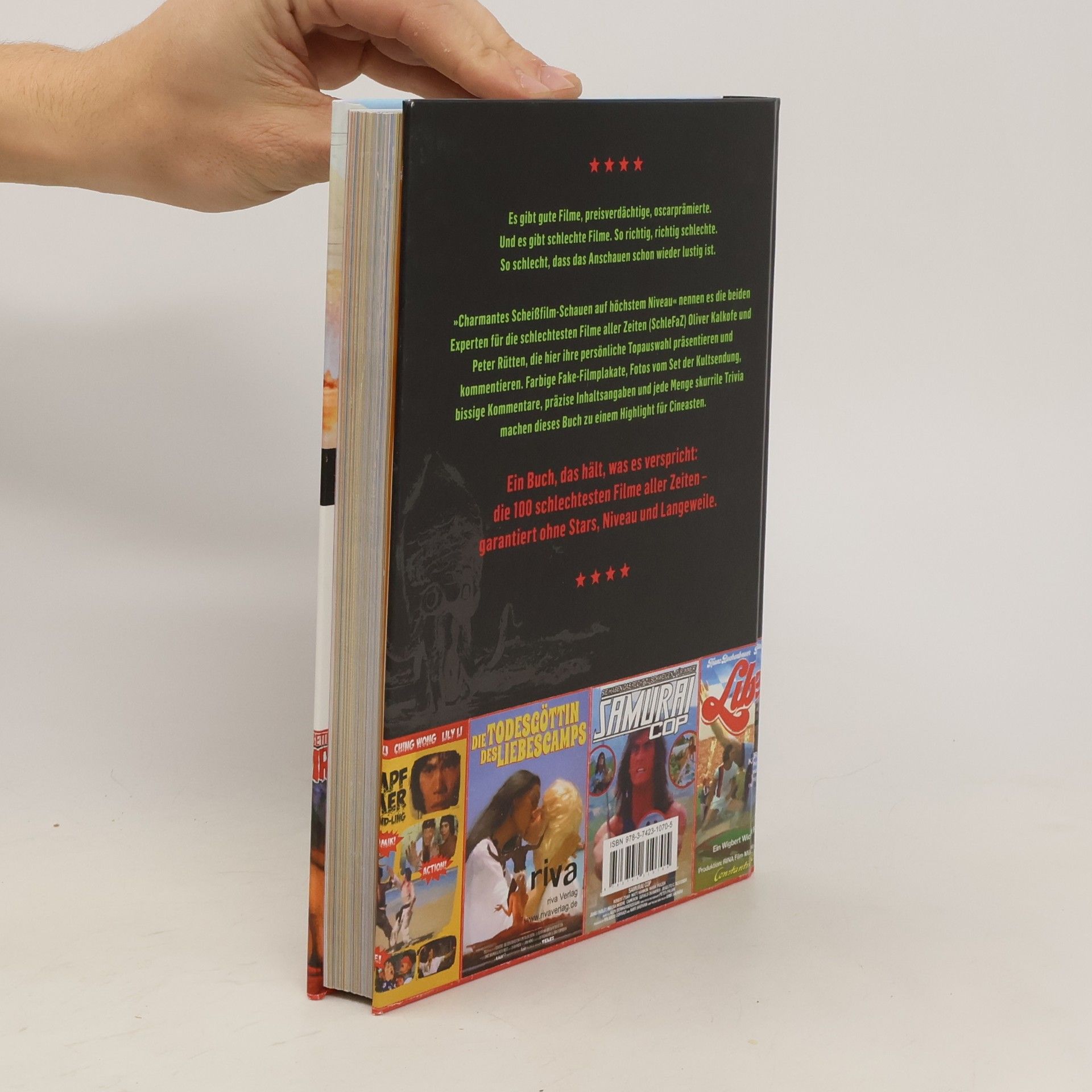 Es gibt gute Filme, preisverdächtige, oscarprämierte. Und es gibt schlechte Filme. So richtig, richtig schlechte. So schlecht, dass das Anschauen schon wieder lustig ist. »Charmantes Scheißfilm-Schauen auf höchstem Niveau« nennen es die beiden Experten für die schlechtesten Filme aller Zeiten (SchleFaZ) Oliver Kalkofe und Peter Rütten, die hier ihre persönliche Topauswahl präsentieren und kommentieren. Farbige Fake-Filmplakate, Fotos vom Set der Kultsendung, bissige Kommentare, präzise Inhaltsangaben und jede Menge skurrile Trivia machen dieses Buch zu einem Highlight für Cineasten. Ein Buch, das hält, was es verspricht: die 100 schlechtesten Filme aller Zeiten – garantiert ohne Stars, Niveau und Langeweile.