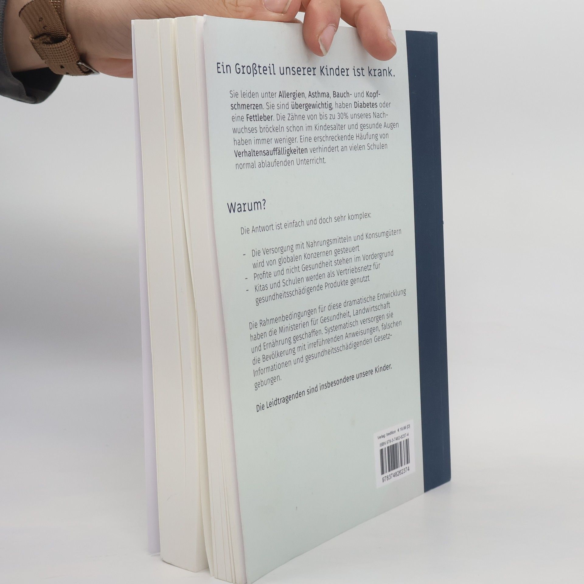Ein Großteil unserer Kinder ist krank. Sie leiden unter Allergien, Asthma, Bauch- und Kopfschmerzen. Sie sind übergewichtig, haben Diabetes oder eine Fettleber. Die Zähne von bis zu 30% unseres Nachwuchses bröckeln schon im Kindesalter und gesunde Augen haben immer weniger. Eine erschreckende Häufung von Verhaltensauffälligkeiten verhindert an vielen Schulen normal ablaufenden Unterricht. WARUM? Die Antwort ist einfach und doch sehr komplex: Die Versorgung von Nahrungsmitteln und Konsumgütern wird von globalen Konzernen gesteuert. Profite und nicht Gesundheit stehen im Vordergrund. Kitas und Schulen werden als Vertriebsnetz für gesundheitsschädigende Produkte genutzt. Die Rahmenbedingungen für diese dramatische Entwicklung haben die Ministerien für Gesundheit, Landwirtschaft und Ernährung geschaffen. Systematisch versorgen sie die Bevölkerung mit irreführenden Anweisungen, falschen Informationen und gesundheitsschädigenden Gesetzgebungen. Die Leidtragenden sind insbesondere unsere Kinder.
