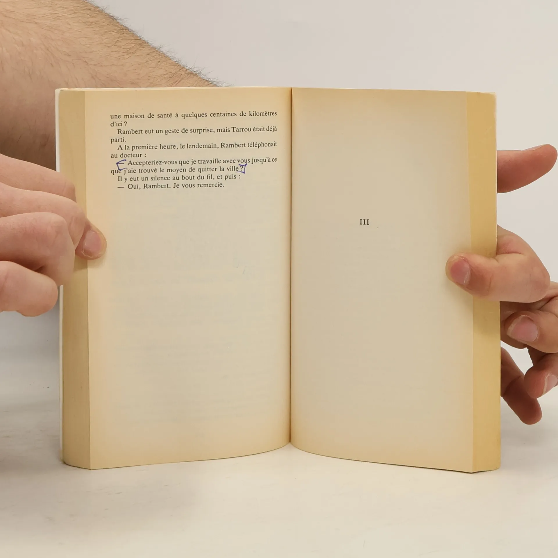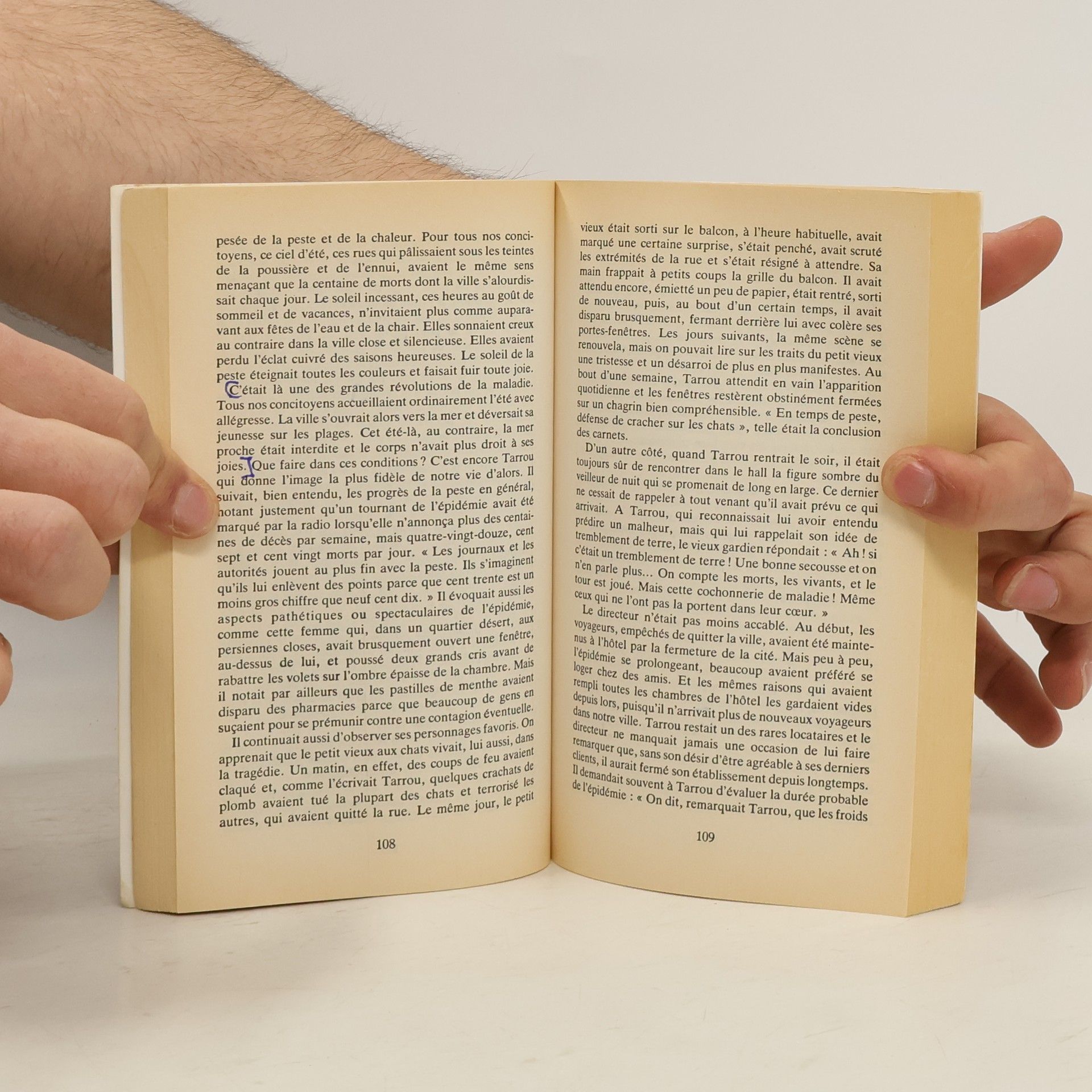 - Naturellement, vous savez ce que c'est, Rieux ?¶- J'attends le résultat des analyses.¶- Moi, je le sais. Et je n'ai pas besoin d'analyses. J'ai fait une partie de ma carrière en Chine, et j'ai vu quelques cas à Paris, il y a une vingtaine d'années. Seulement, on n'a pas osé leur donner un nom, sur le moment... Et puis, comme disait un confrère : " C'est impossible, tout le monde sait qu'elle a disparu de l'Occident. " Oui, tout le monde le savait, sauf les morts. Allons, Rieux, vous savez aussi bien que moi ce que c'est...¶- Oui, Castel, dit-il, c'est à peine croyable. Mais il semble bien que ce soit la peste.¶