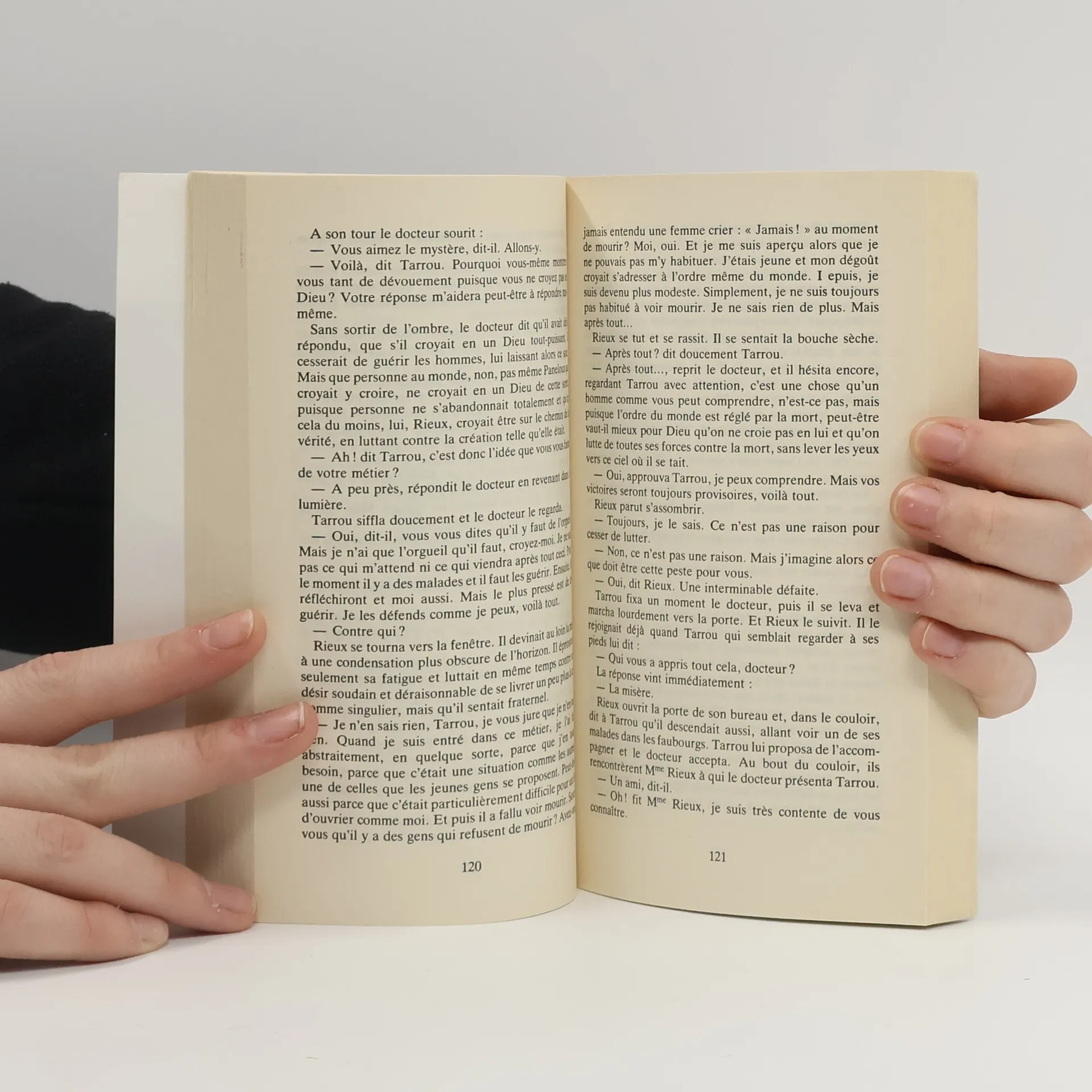 - Naturellement, vous savez ce que c'est, Rieux ?¶- J'attends le résultat des analyses.¶- Moi, je le sais. Et je n'ai pas besoin d'analyses. J'ai fait une partie de ma carrière en Chine, et j'ai vu quelques cas à Paris, il y a une vingtaine d'années. Seulement, on n'a pas osé leur donner un nom, sur le moment... Et puis, comme disait un confrère : " C'est impossible, tout le monde sait qu'elle a disparu de l'Occident. " Oui, tout le monde le savait, sauf les morts. Allons, Rieux, vous savez aussi bien que moi ce que c'est...¶- Oui, Castel, dit-il, c'est à peine croyable. Mais il semble bien que ce soit la peste.¶