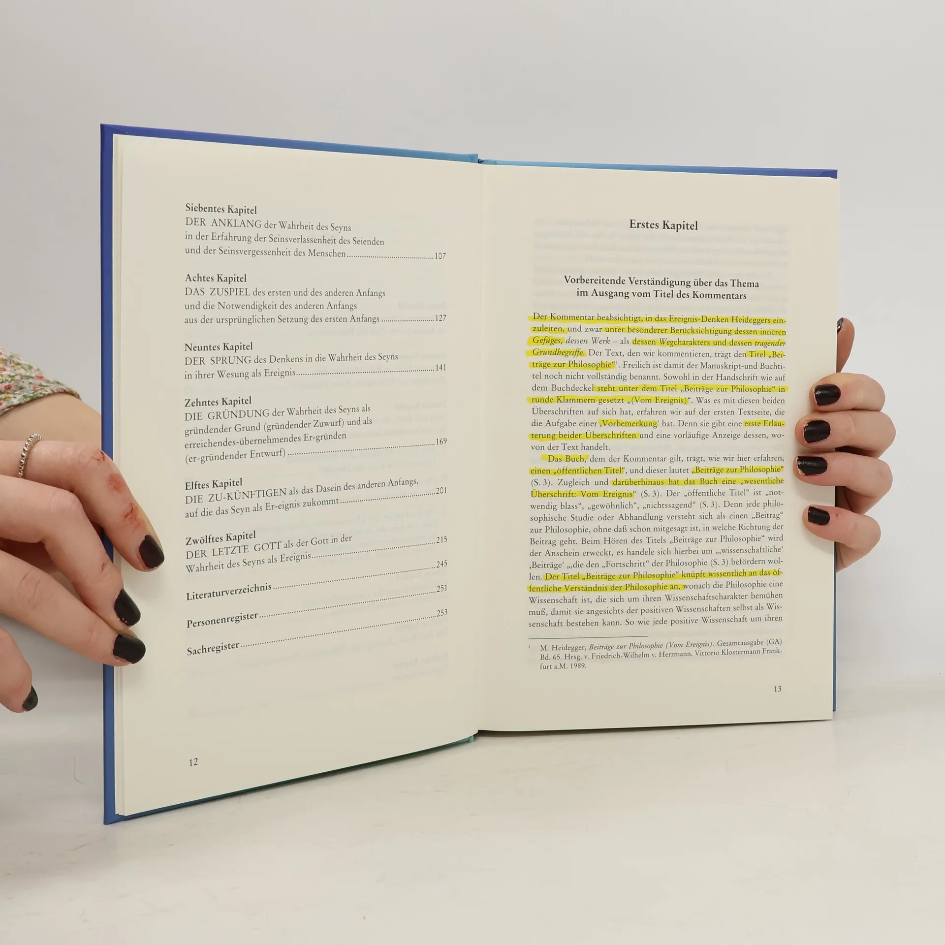 Vorwort – Erstes Kapitel: Vorbereitende Verständigung über das Thema im Ausgang vom Titel des Kommentars – Zweites Kapitel: „Sein und Zeit“ im Rückblick aus den „Beiträgen zur Philosophie (Vom Ereignis) – Drittes Kapitel: „Sein und Zeit“, die Hermeneutik des Daseins und der transzendentalhorizontale Weg der Seinsfrage im Aufriß – Viertes Kapitel: Das Überspringen der Transzendenz und die Überwindung des Horizontes – Fünftes Kapitel: Der Aufriß der „Beiträge zur Philosophie (Vom Ereignis)“ – Sechstes Kapitel: Fuge und System – Siebentes Kapitel: DER ANKLANG der Wahrheit des Seyns in der Erfahrung der Seinsverlassenheit des Seienden und der Seinsvergessenheit des Menschen – Achtes Kapitel: DAS ZUSPIEL des ersten und des anderen Anfangs und die Notwendigkeit des anderen Anfangs aus der ursprünglichen Setzung des ersten Anfangs – Neuntes Kapitel: DER SPRUNG des Denkens in die Wahrheit des Seyns in ihrer Wesung als Ereignis – Zehntes Kapitel: DIE GRÜNDUNG der Wahrheit des Seyns als gründender Grund (gründender Zuwurf) und als erreichendes-übernehmendes Er-gründen (er-gründender Entwurf) – Elftes Kapitel: DIE ZUKÜNFTIGEN als das Dasein des anderen Anfangs, auf die das Seyn als Er-eignis zukommt – Zwölftes Kapitel: DER LETZTE GOTT als der Gott in der Wahrheit des Seyns als Ereignis.