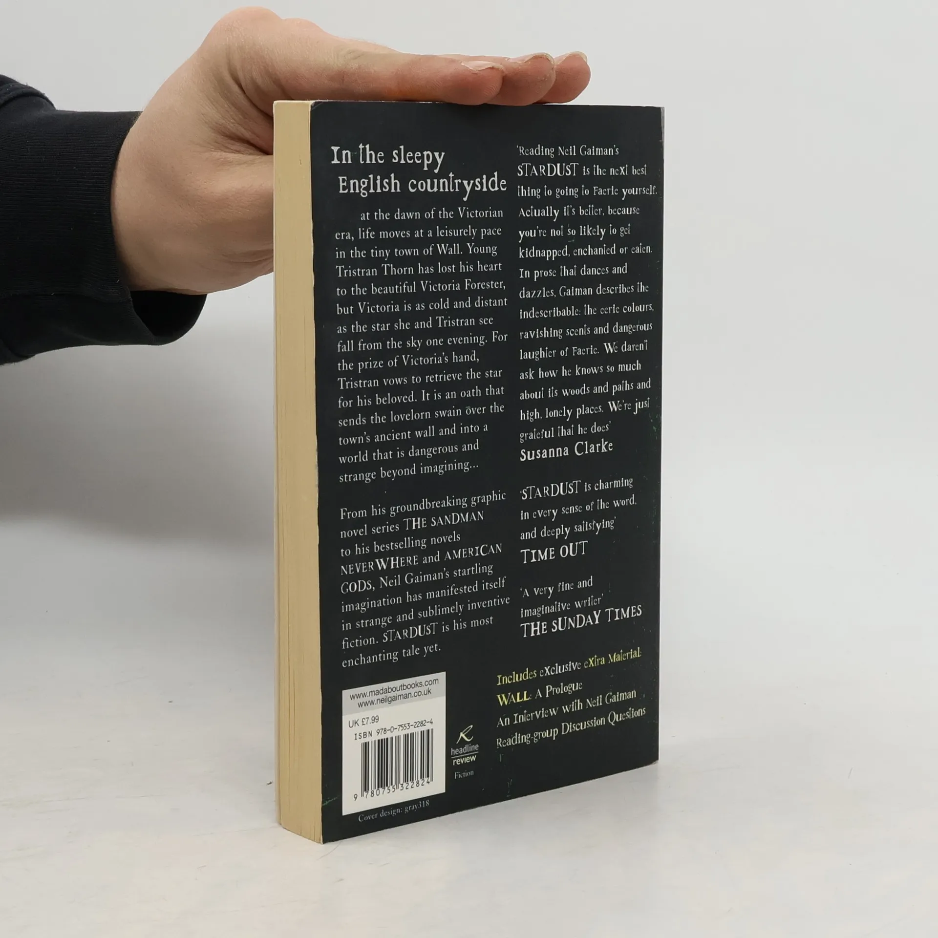 Stardust is an enchanting and enthralling novel from Sunday Times bestseller and master storyteller Neil Gaiman. 'Charming in every sense of the word, and deeply satisfying' (Time Out), it will delight fans of Terry Pratchett and J.R.R. Tolkien's The Hobbit, as well as those who loved the feature film starring Robert De Niro, Claire Danes, Rupert Everett and Michelle Pfeiffer among others. Life moves at a leisurely pace in the tiny town of Wall - named after the imposing stone barrier which separates the town from a grassy meadow. Here, young Tristran Thorn has lost his heart to the beautiful Victoria Forester and for the coveted prize of her hand, Tristran vows to retrieve a fallen star and deliver it to his beloved. It is an oath that sends him over the ancient wall and into a world that is dangerous and strange beyond imagining . . . Includes extra material exclusive to this Headline edition.