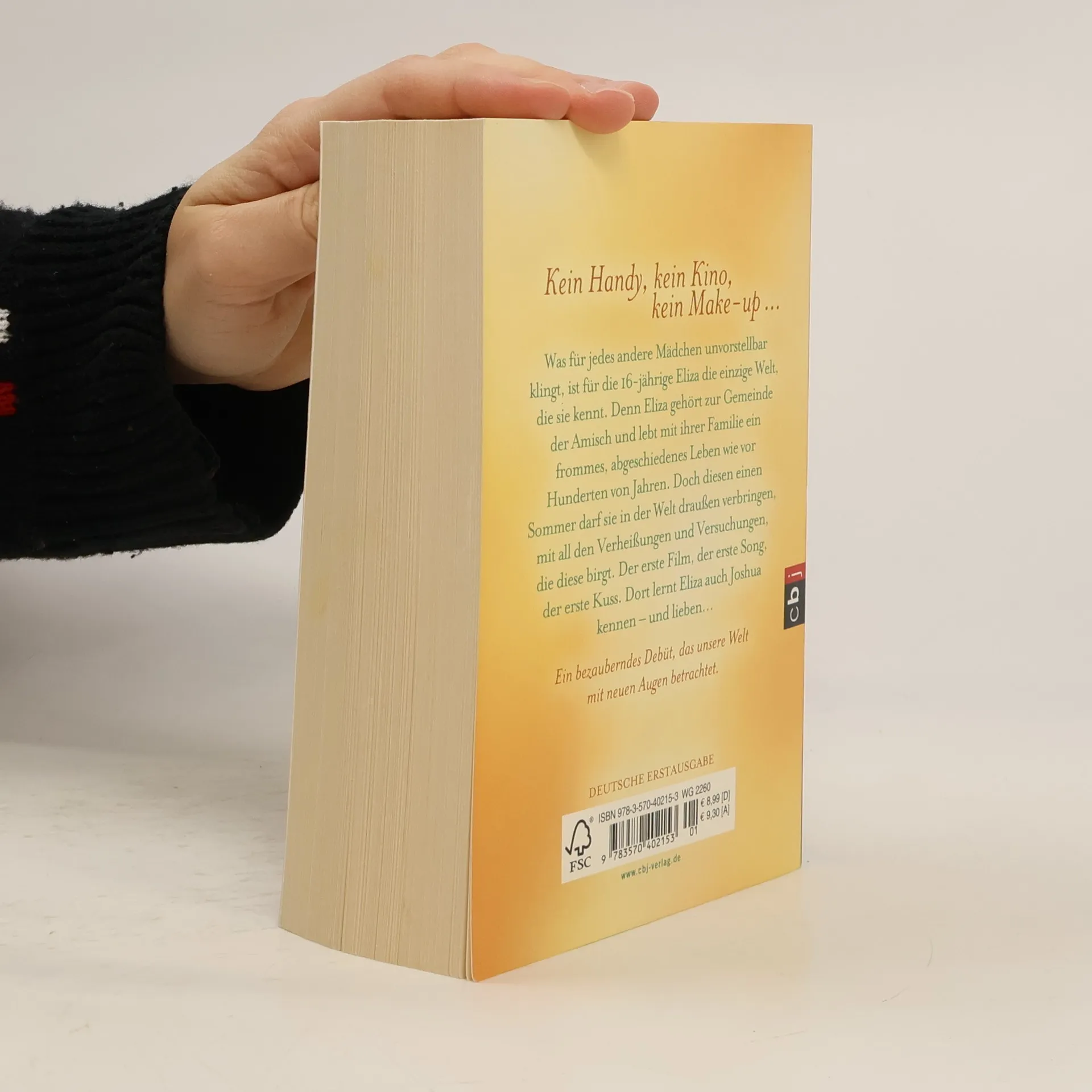 Ihre Welt ist eine andere – ein Mädchen auf der Suche nach sich selbst Kein Handy, kein Kino, kein Make-up … Was für jedes andere Mädchen unvorstellbar klingt, ist für die 16-jährige Eliza die einzige Welt, die sie kennt. Eliza gehört zur Gemeinde der Amish und lebt mit ihrer Familie ein frommes, abgeschiedenes Leben wie vor Hunderten Jahren. Doch diesen einen Sommer darf sie in der Welt draußen verbringen, mit all den Verheißungen und Versuchungen, die diese birgt. Der erste Film, der erste Song, der erste Kuss. Dort lernt Eliza auch Joshua kennen. Sie weiß, sie wird am Ende eine Entscheidung treffen müssen … und diese wird endgültig sein.