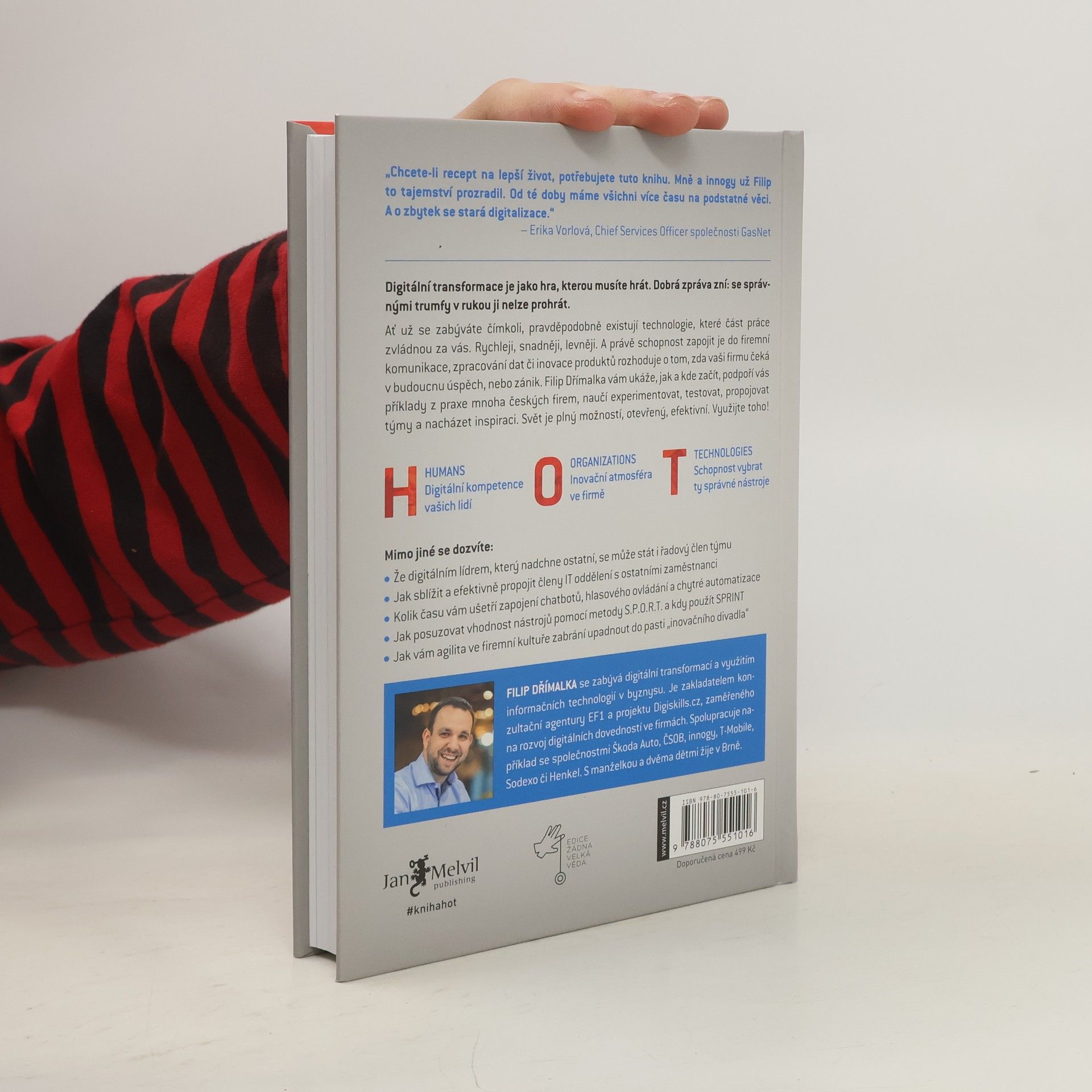 Digitální transformace je jako hra, kterou musíte hrát. Dobrá zpráva zní: se správnými trumfy v rukou ji nelze prohrát. Ať už se zabýváte čímkoli, pravděpodobně existují technologie, které část práce zvládnou za vás. Rychleji, snadněji, levněji. A právě schopnost zapojit je do firemní komunikace, zpracování dat či inovace produktů rozhoduje o tom, zda vaši firmu čeká v budoucnu úspěch, nebo zánik. Filip Dřímalka vám ukáže, jak a kde začít, podpoří vás příklady z praxe mnoha českých firem, naučí experimentovat, testovat, propojovat týmy a nacházet inspiraci. Svět je plný možností, otevřený, efektivní. Využijte toho! H: HUMANS Digitální kompetence vašich lidí O: ORGANIZATIONS Inovační atmosféra ve firmě T: TECHNOLOGIES Schopnost vybrat ty správné nástroje Mimo jiné se dozvíte: - Že digitálním lídrem, který nadchne ostatní, se může stát i řadový člen týmu - Jak sblížit a efektivně propojit členy IT oddělení s ostatními zaměstnanci - Kolik času vám ušetří zapojení chatbotů, hlasového ovládání a chytré automatizace - Jak posuzovat vhodnost nástrojů pomocí metody S.P.O.R.T. a kdy použít SPRINT - Jak vám agilita ve firemní kultuře zabrání upadnout do pasti „inovačního divadla“
