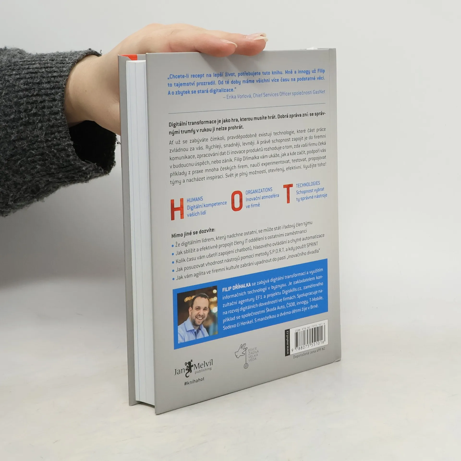 Digitální transformace je jako hra, kterou musíte hrát. Dobrá zpráva zní: se správnými trumfy v rukou ji nelze prohrát. Ať už se zabýváte čímkoli, pravděpodobně existují technologie, které část práce zvládnou za vás. Rychleji, snadněji, levněji. A právě schopnost zapojit je do firemní komunikace, zpracování dat či inovace produktů rozhoduje o tom, zda vaši firmu čeká v budoucnu úspěch, nebo zánik. Filip Dřímalka vám ukáže, jak a kde začít, podpoří vás příklady z praxe mnoha českých firem, naučí experimentovat, testovat, propojovat týmy a nacházet inspiraci. Svět je plný možností, otevřený, efektivní. Využijte toho! H: HUMANS Digitální kompetence vašich lidí O: ORGANIZATIONS Inovační atmosféra ve firmě T: TECHNOLOGIES Schopnost vybrat ty správné nástroje Mimo jiné se dozvíte: - Že digitálním lídrem, který nadchne ostatní, se může stát i řadový člen týmu - Jak sblížit a efektivně propojit členy IT oddělení s ostatními zaměstnanci - Kolik času vám ušetří zapojení chatbotů, hlasového ovládání a chytré automatizace - Jak posuzovat vhodnost nástrojů pomocí metody S.P.O.R.T. a kdy použít SPRINT - Jak vám agilita ve firemní kultuře zabrání upadnout do pasti „inovačního divadla“
