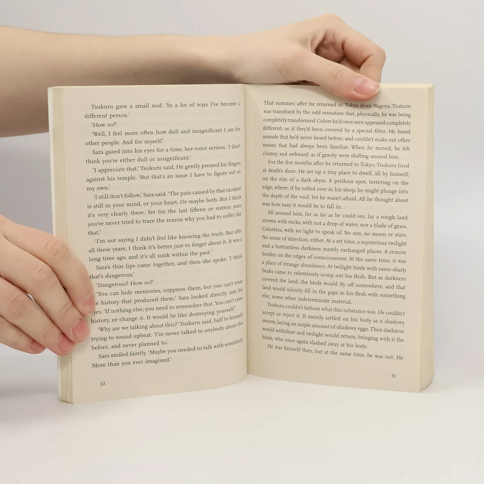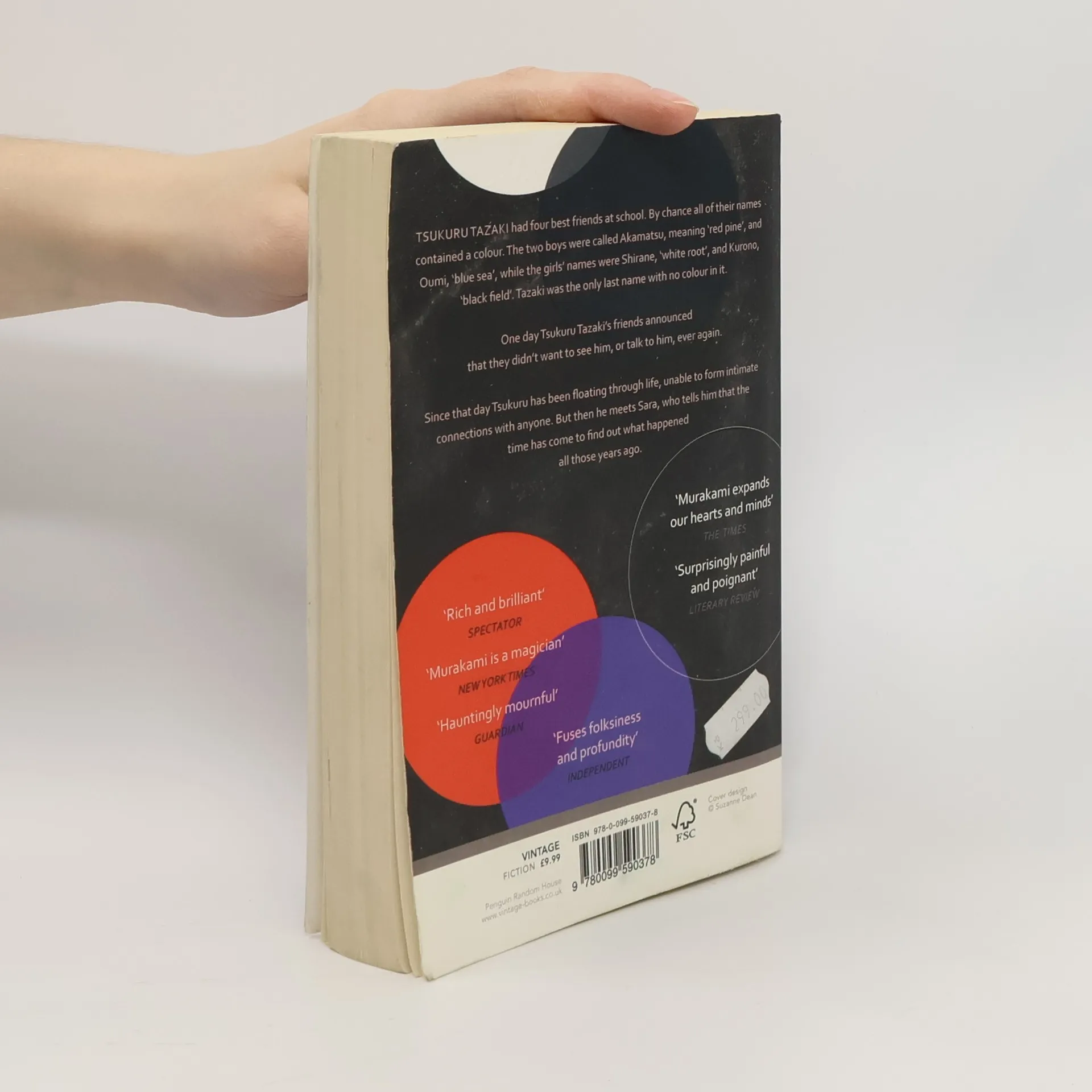 Tsukuru Tazaki had four best friends at school. By chance all of their names contained a colour. The two boys were called Akamatsu, meaning 'red pine', and Oumi, 'blue sea', while the girls' names were Shirane, 'white root', and Kurono, 'black field'. Tazaki was the only last name with no colour in it.