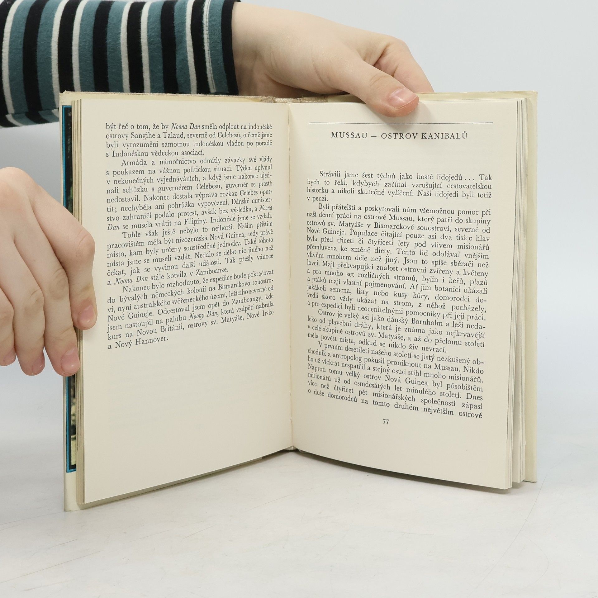Dánský filmař a tiskový zpravodaj, sekretář výpravy uskutečňované na lodi Noona Dan počátkem šedesátých let velmi poutavě a přitom ve zkratce líčí jihomořské přírodní podmínky a hlavně život různých necivilizovaných kmenů žijících na ostrovech Palawan, Mussau a Nová Británie. Autor podstoupil nebezpečné cesty za lidmi, oddělenými pralesem od ostatního světa, a podává o nich cenná svědectví, která jsou provázena citlivým porozuměním.