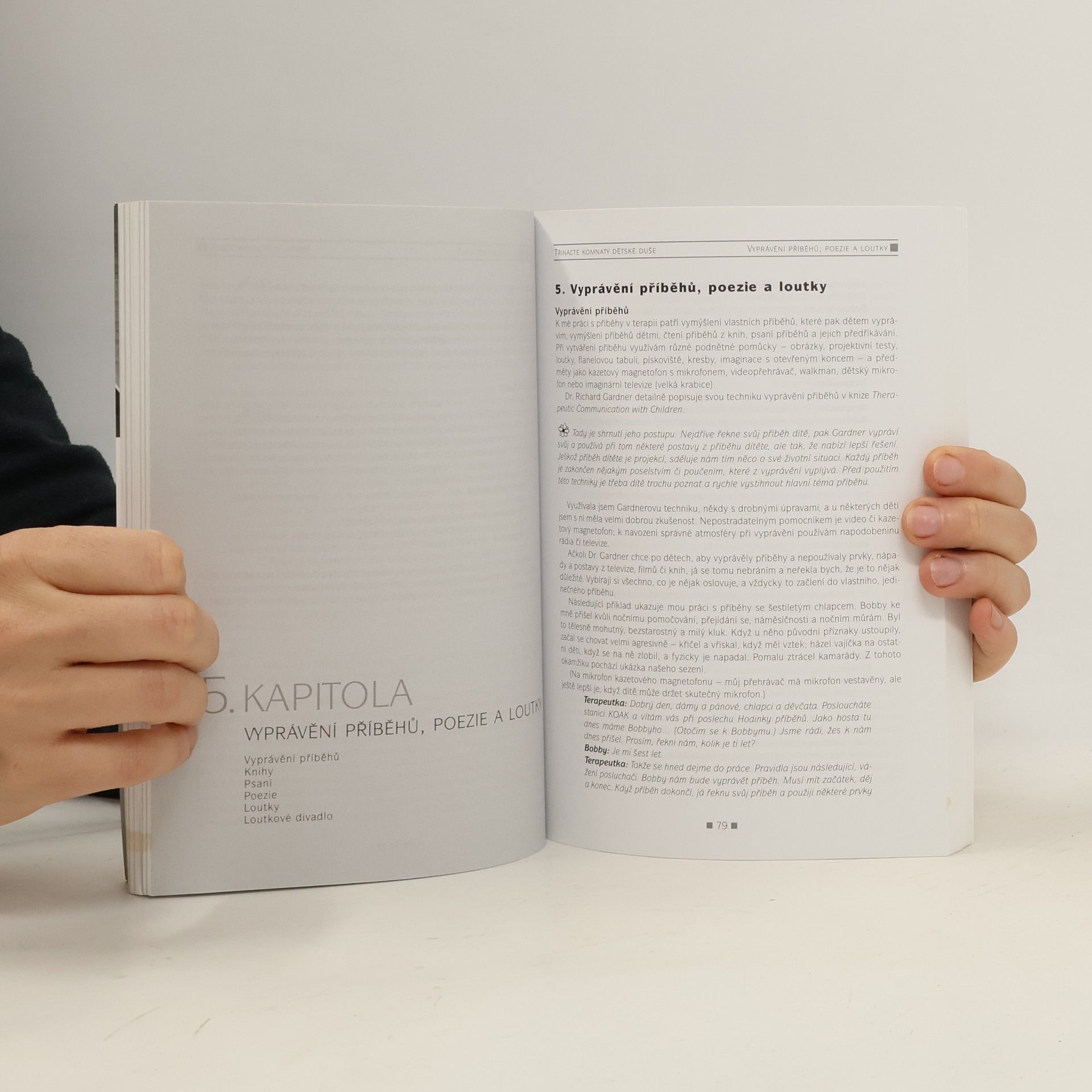Kniha obsahuje mnoho konkrétních ukázek z terapeutické práce s dětmi. Ukazuje čtenáři množství rafinovaných technik, jak nenásilně zjistit, kde dítě v jeho psychickém a emocionálním životě tzv."tlačí pata". Nahlédnutí do dětské duše prostřednictvím kreseb, práce s hlínou, sny, přehrávání životních rolí a situací... a mnoha dalších terapeutických technik. Autorka, psycholožka a terapeutka věnující se práci s dětmi, sděluje své osobní zkušenosti z praxe. Ukazuje možnosti, které nabízejí popisované terapeutické techniky a Gestalt přístup - malí klienti jejich prostřednictvím navazují s terapeutem lepší komunikaci, sdělují své pocity a problémy, na které slova nestačí. Zmíněná terapie se výborně uplatňuje i při práci s dětmi trpícími poruchami chování. Zajímavá, osobitá kniha. Ač vydaná poprvé už před třiceti lety, neztratila nic na své atraktivitě. Navíc je napsaná čtivě, srozumitelně, takže ji mohou číst odborníci i laici: psychologové, pedagogové, rodiče.