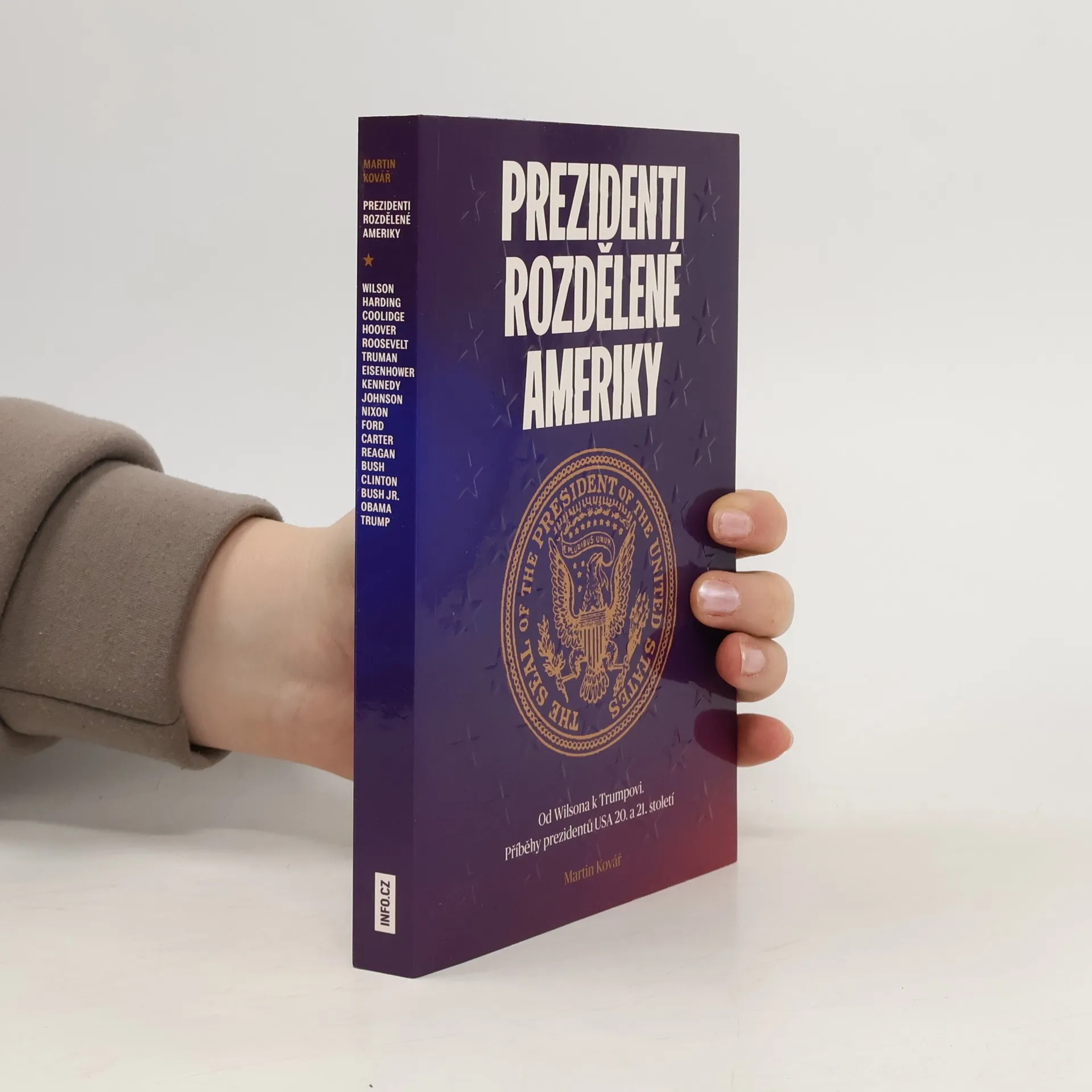 Od Wilsona k Trumpovi: Příběhy amerických prezidentů 20. a 21. století. Americký prezident je nejen hlavou státu, ale i jedním z nejmocnějších politiků na světě. Historik Martin Kovář glosuje jejich příběhy od Woodrowa Wilsona až po Donalda Trumpa. Ukazuje složitý vývoj Spojených státech amerických, jejich odvěkou rozdělenost i opakující se problémy, stejně jako tragiku a novou naději v dějinách 20. a nyní už i 21. století. Ohlíží se za tím, jaké osobnosti v Bílém domě úřadovaly, jak je vnímali jejich současníci v Americe i v zámoří a jak na ně s odstupem času nahlíží velká historie. Byl Franklin D. Roosevelt mocichtivý gigant s tyranskými sklony? Proč patří John F. Kennedy k nejpřeceňovanějším postavám dějin? A nekřivdí naopak historie Richardu Nixonovi či Georgi W. Bushovi? Kniha Prezidenti vychází z původního úspěšného seriálu INFO.CZ a přináší rovněž množství dalších speciálně připravených materiálů a textů.