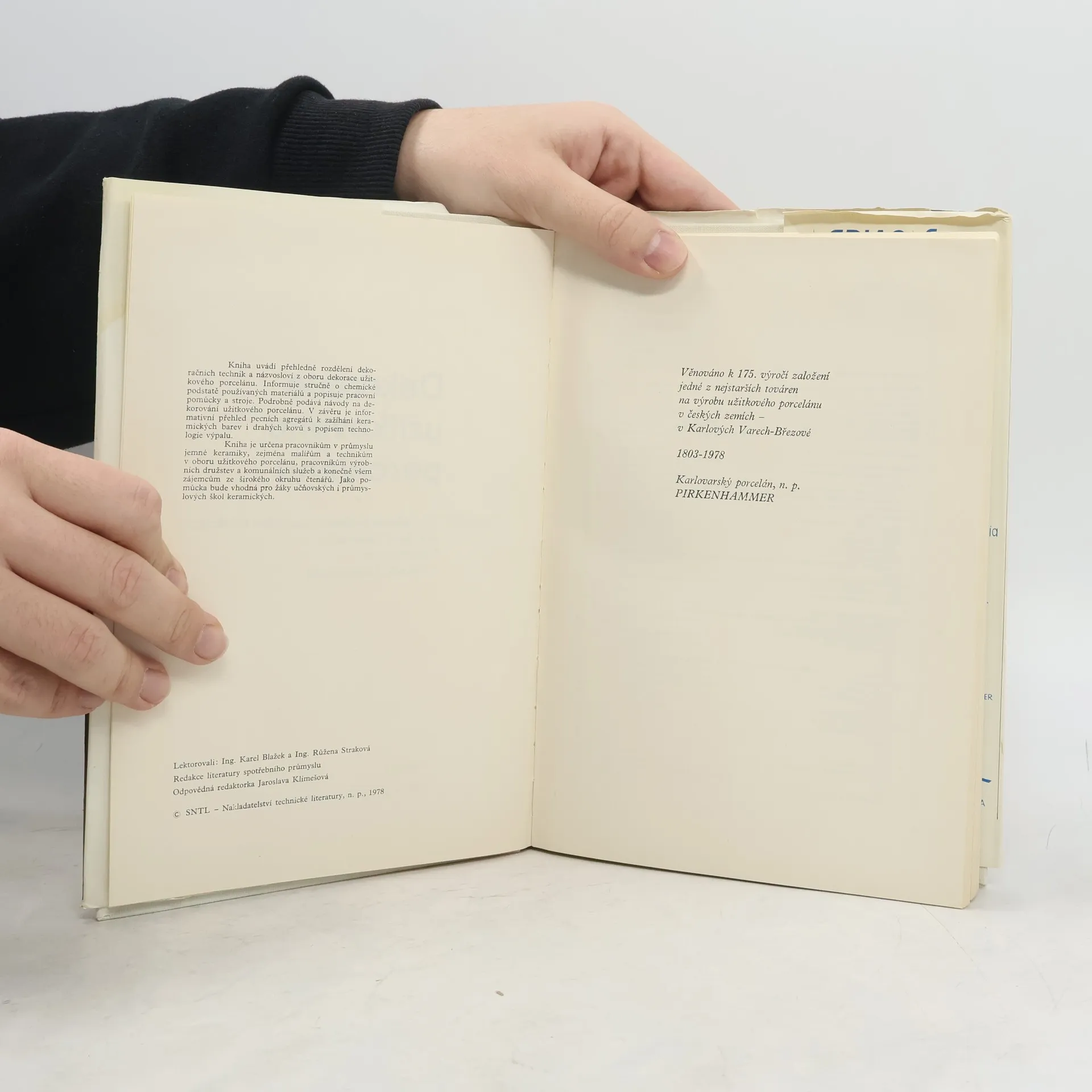 Po přehledu vývoje dekorování užitkového porcelánu a po vysvětlení základních pojmů pojednávají autoři o druzích dekoračního materiálu a o běžných vadách keramické dekorace. Podrobně popisují jednotlivé techniky ručního i strojového zdobení porcelánu a různé typy zažíhacích pecí, v nichž se dekorované výrobky vypalují. V knize 91 obrázků (16 v barevné příloze) a 27 tabulek.