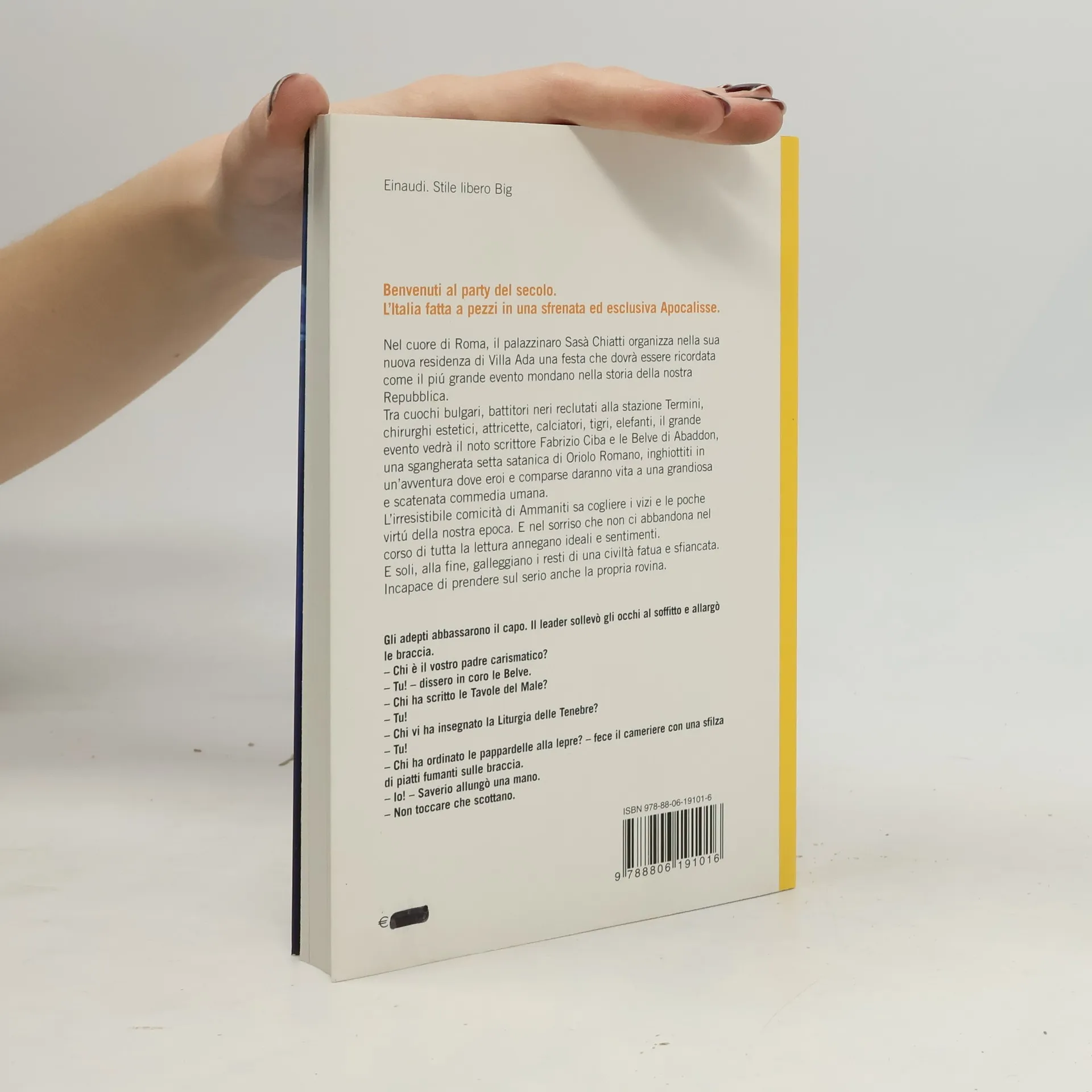 Nel cuore di Roma, il palazzinaro Sasà Chiatti organizza nella sua nuova residenza di Villa Ada una festa che dovrà essere ricordata come il più grande evento mondano nella storia della nostra Repubblica. Tra cuochi bulgari, battitori neri reclutati alla stazione Termini, chirurghi estetici, attricette, calciatori, tigri, elefanti, il grande evento vedrà il noto scrittore Fabrizio Ciba e le Belve di Abaddon, una sgangherata setta satanica di Oriolo Romano, inghiottiti in un'avventura dove eroi e comparse daranno vita a una grandiosa e scatenata commedia umana. La comicità di Ammaniti sa cogliere i vizi e le poche virtù della nostra epoca. E nel sorriso che non abbandona nel corso di tutta la lettura annegano ideali e sentimenti. E soli, alla fine, galleggiano i resti di una civiltà fatua e sfiancata. Incapace di prendere sul serio anche la propria rovina. Un romanzo spericolato dove Niccolò Ammaniti riunisce tutte le caratteristiche che ne fanno il beniamino di milioni di lettori. Il divertimento più scatenato insieme all'amore incondizionato per personaggi che non lasceremo più, fino all'ultima pagina. L'immaginazione anarchica insieme a una lucidità senza scampo che fruga e rivela ogni nostro più vergognoso segreto.