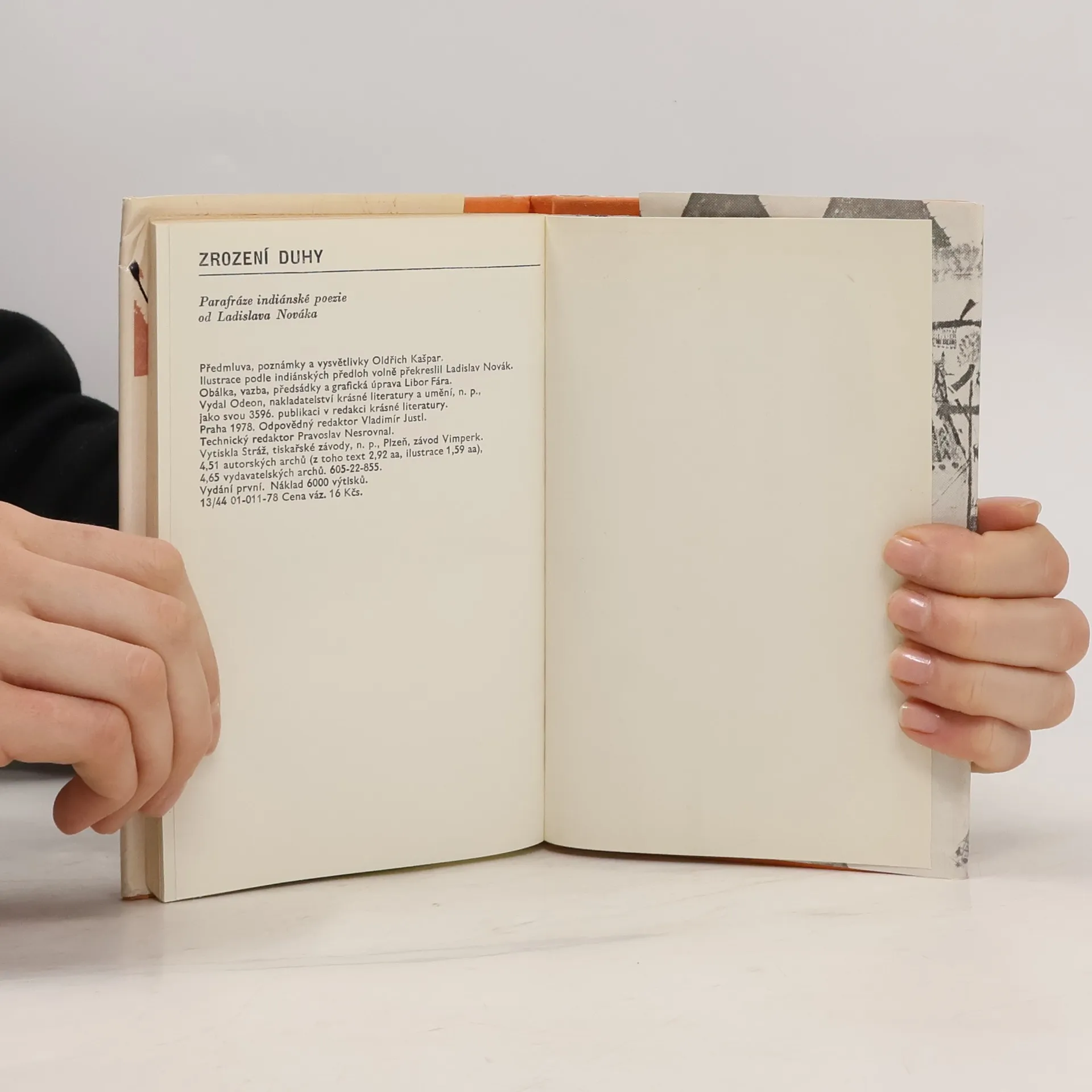 Parafráze indiánské poezie od Ladislava Nováka. První oddíl – Z plání a pralesů – podává čtenáři v širokém výběru poezii lovců, sběračů a primitivních zemědělců z rozlehlých oblastí Severní, Střední, v menší míře i Jižní Ameriky. Druhý oddíl – Příběh Haskáanaa Nej-jí-by –, přeložený z knížky Claire Gollové Chants peaux rouges, zachycuje dobu, kdy zapuzeni do těsně vymezených rezervací nacházejí Indiáni téměř jedinou útěchu v horoucí písni. Ilustrace podle indiánských předloh volně překreslil Ladislav Novák. Vydání první. 01-011-78