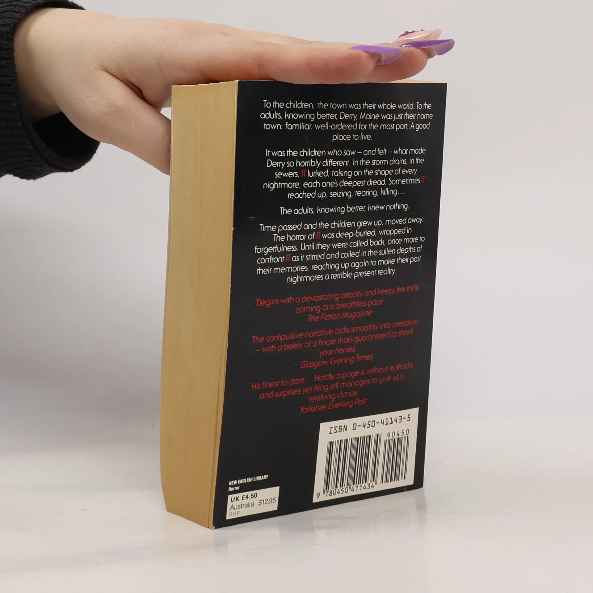 "They were seven teenagers when they first stumbled upon the horror. Now they were grown-up men and women who had gone out into the big world to gain success and happiness. But none of them could withstand the force that drew them back to Derry, Maine to face the nightmare without an end, and the evil without a name. What was it? Read It and find out...if you dare!" - product description.