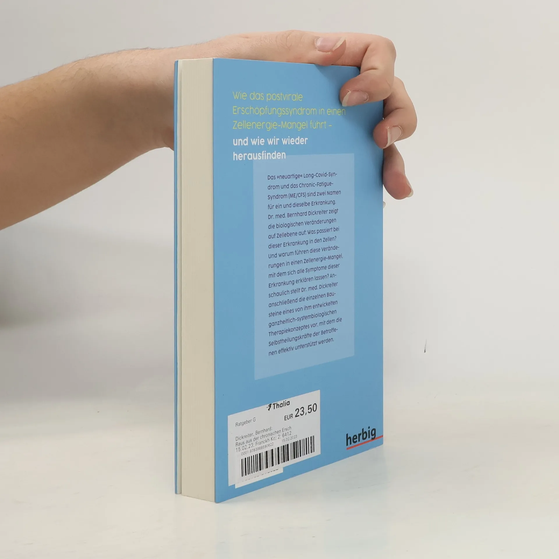 Das „neuartige“ Long-Covid-Syndrom und das Chronic-Fatigue-Syndrom (ME/CFS) sind zwei Namen für ein und dieselbe Erkrankung. Dr. med. Bernhard Dickreiter zeigt erstmalig die biologischen Veränderungen auf Zellebene auf: Was passiert bei dieser Erkrankung in den Zellen, in der Zellumgebung und in den Mitochondrien? Und warum führen diese biologischen Veränderungen in einen Zellenergie-Mangel, mit dem sich alle Symptome dieser Erkrankung erklären lassen? Anschaulich und umfassend erklärt Dr. med Dickreiter anschließend die einzelnen Bausteine eines von ihm entwickelten ganzheitlich-systembiologischen Therapiekonzeptes, mit dem die Selbstheilungskräfte der Betroffenen effektiv unterstützt werden. Mit vielen hilfreichen Hintergrundinformationen und praktischen Tipps.
