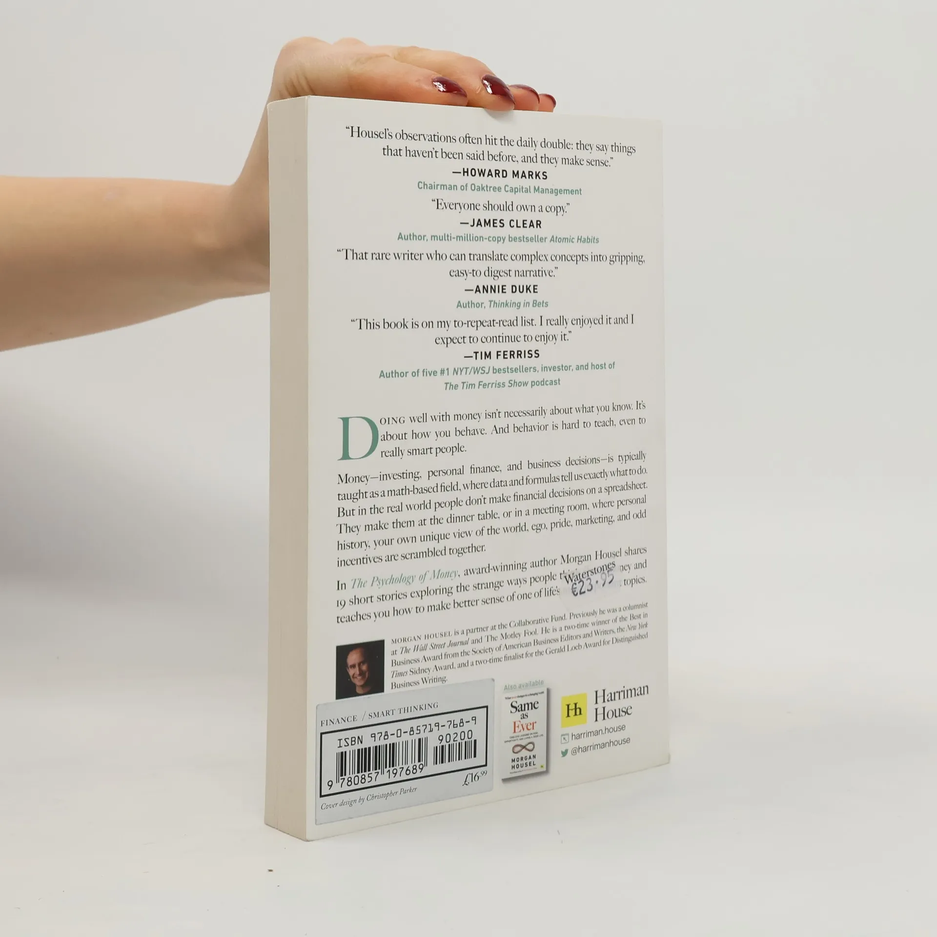Doing well with money isn’t necessarily about what you know. It’s about how you behave. And behavior is hard to teach, even to really smart people. Money—investing, personal finance, and business decisions—is typically taught as a math-based field, where data and formulas tell us exactly what to do. But in the real world people don’t make financial decisions on a spreadsheet. They make them at the dinner table, or in a meeting room, where personal history, your own unique view of the world, ego, pride, marketing, and odd incentives are scrambled together. In The Psychology of Money, award-winning author Morgan Housel shares 19 short stories exploring the strange ways people think about money and teaches you how to make better sense of one of life’s most important topics.