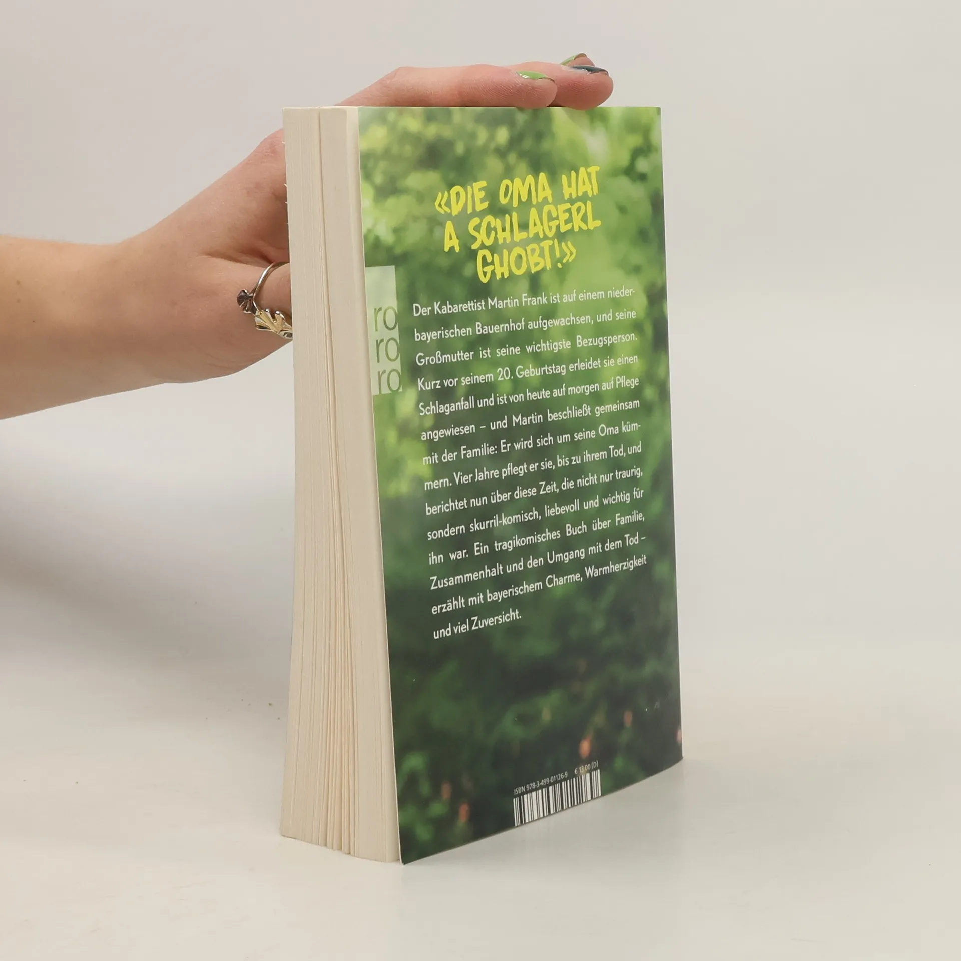 «Die Oma hat a Schlagerl ghobt!» Der Kabarettist Martin Frank ist auf einem niederbayrischen Bauernhof aufgewachsen, und seine Großmutter ist seine wichtigste Bezugsperson. Als er gerade 19 ist, erleidet sie einen Schlaganfall und ist von heute auf morgen auf Pflege angewiesen – und Martin beschließt: Er wird sich um seine Oma kümmern. Vier Jahre pflegt er sie, bis zu ihrem Tod, und berichtet nun über diese Zeit, die nicht nur traurig, sondern skurril-komisch, liebevoll und wichtig für ihn war. Ein tragikomisches Buch über Familie , Zusammenhalt und den Umgang mit dem Tod – erzählt mit bayrischem Charme, Warmherzigkeit und viel Zuversicht .