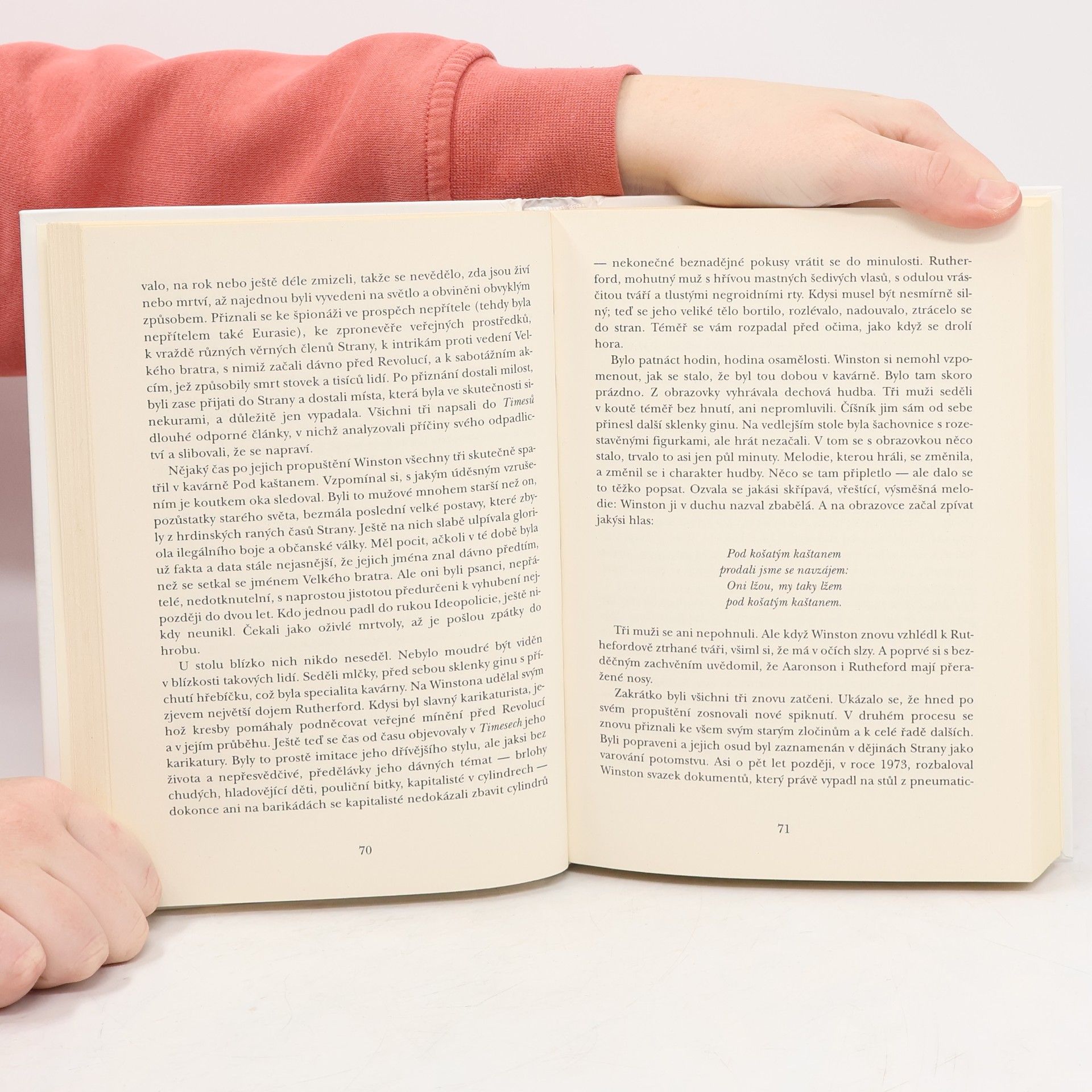 Winston Smith žije v Oceánii, jedné ze tří velmocí, které existují v Orwellově antiutopickém světě. V této zemi vládne svou neomezenou mocí Strana, v jejímž čele stojí (snad) imaginární postava Velkého bratra. Velký bratr tě sleduje! Heslo, které občané Oceánie spatřují mnohokrát denně na plakátech s údajnou podobiznou Velkého bratra v nadživotní velikosti. Ve Winstonově bytě, stejně jako v bytech ostatních členů Strany a na veřejných prostranstvích, jsou umístěny obrazovky, které nepřetržitě sledují veškeré dění ve svém dosahu. Záznamy obrazovek sledují příslušníci Ideopolicie, kteří se snaží odhalit jakýkoliv zločin proti Straně (ideozločin). Jedinými občany, kteří nejsou tak důsledně sledování, zůstávájí dělníci – proléti. Jejich životní podmínky jsou ale tak bídné, že opravdu nemají myšlenky na nějaký ideozločin. Navíc jsou dokonale ovládáni stranickou propagandou a slepě věří smyšleným úspěchům, které se dozví z obrazovky.