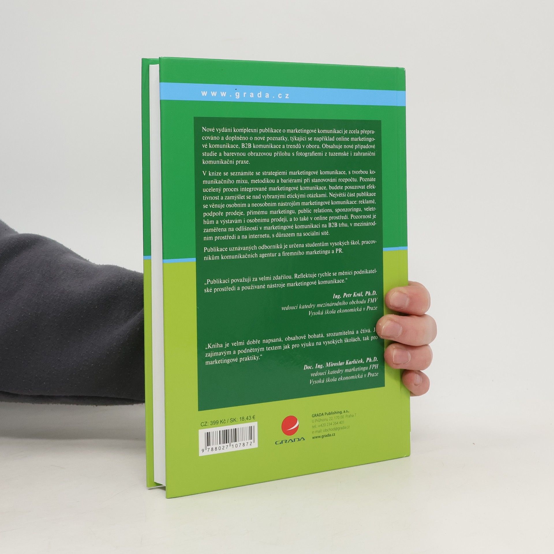 Nové vydání komplexní publikace o marketingové komunikaci je zcela přepracováno a doplněno o nové poznatky, týkající se například online marketingové komunikace, B2B komunikace a trendech v oboru. Obsahuje nové případové studie a barevnou obrazovou přílohu s fotografiemi z tuzemské i zahraniční komunikační praxe. V knize se seznámíte se strategiemi marketingové komunikace, s tvorbou komunikačního mixu, metodikou a bariérami při stanovování rozpočtu. Poznáte ucelený proces integrované marketingové komunikace, budete posuzovat efektivnost a zamýšlet se nad vybranými etickými otázkami. Největší část publikace se věnuje osobním a neosobním nástrojům marketingové komunikace: reklamě, podpoře prodeje, přímému marketingu, public relations, sponzoringu, veletrhům a výstavám i osobnímu prodeji, a to také v online prostředí. Pozornost je zaměřena na odlišnosti v marketingové komunikaci na B2B trhu, v mezinárodním prostředí a na internetu, s důrazem na sociální sítě. Publikace uznávaných odborníků je určena studentům vysokých škol, pracovníkům komunikačních agentur a firemního marketingu a PR.