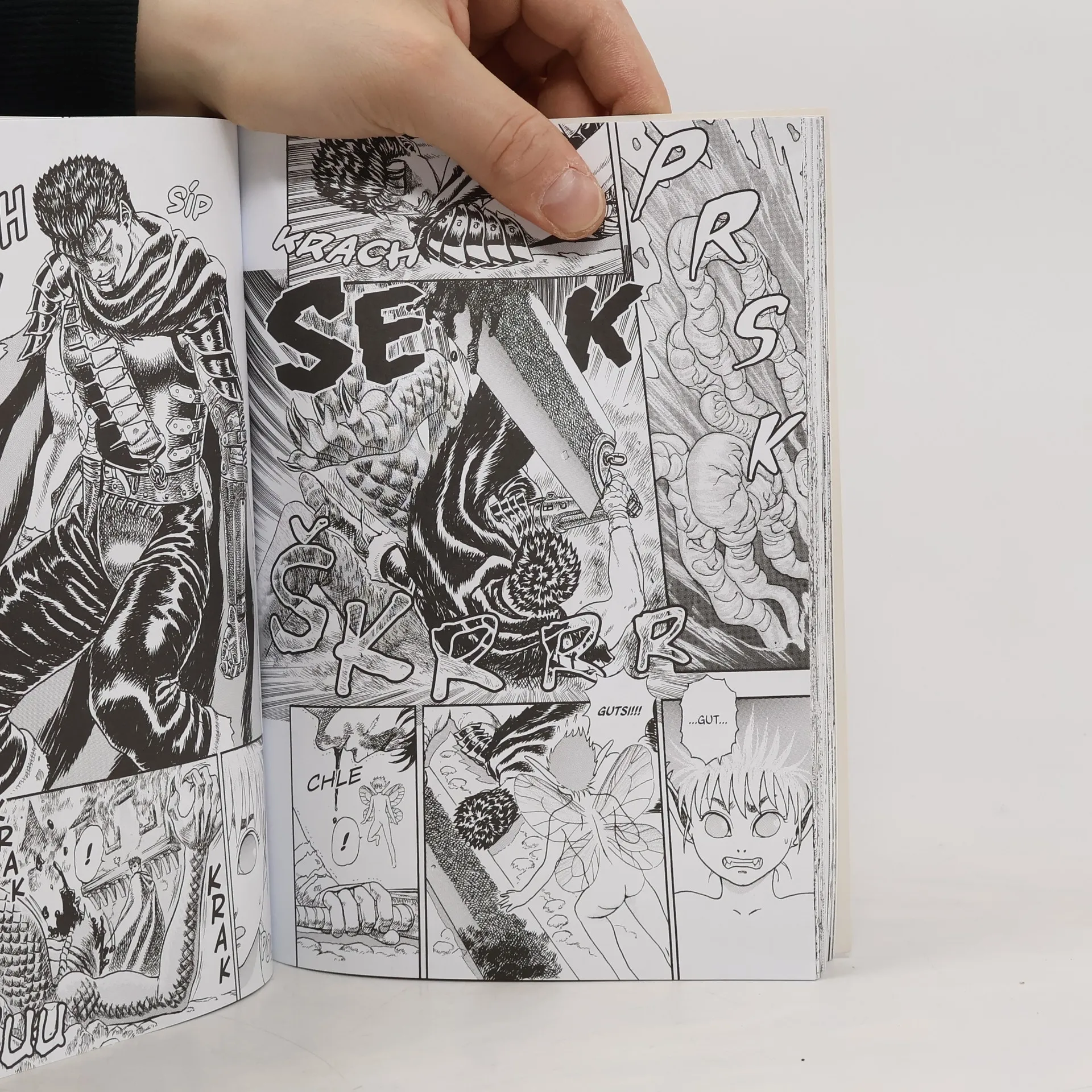 Osudový, krvavý příběh s prvky romantiky a velkou porcí akce! Dospělá fantasy, která si získala davy fanoušků, televizní seriál, celovečerní filmy i počítačové hry! Hrdinou je Guts, Černý šermíř, obávaný bojovník, o kterém se raději nemluví nahlas. Má obrovský meč, kovovou ruku, stovky jizev z bojů a mučení a znamení, které k němu přitahuje síly zla. Ale ne vždycky byl takový. Příběh se postupně vrací zpátky do dob, kdy je Guts ještě mladý a poznává Griffitha, charismatického velitele oddílu Jestřábů. Muže, který mu změní život.