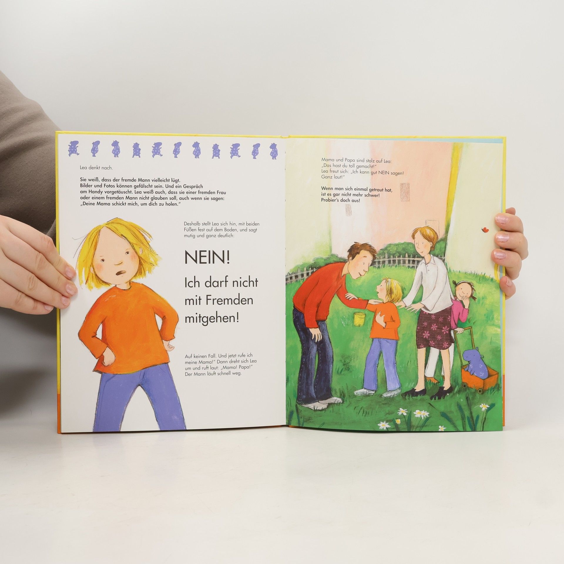 So werden Kinder stark: Susa Apenrade erzählt von Situationen, in denen Lea sich nicht gut fühlt: wenn Jan sie ärgert, wenn die Nachbarin sie wieder mal kurz drücken oder Onkel Meier sie einfach so auf den Schoß nehmen will. Was soll Lea da nur tun? Lea stellt sich mit beiden Beinen fest auf den Boden und sagt laut und selbstbewusst „Nein!“. Und das ist auch die richtige Antwort, wenn ein Fremder kommt und versucht, Lea wegzulocken. Lea ruft laut: „Nein, ich geh nicht mit!“