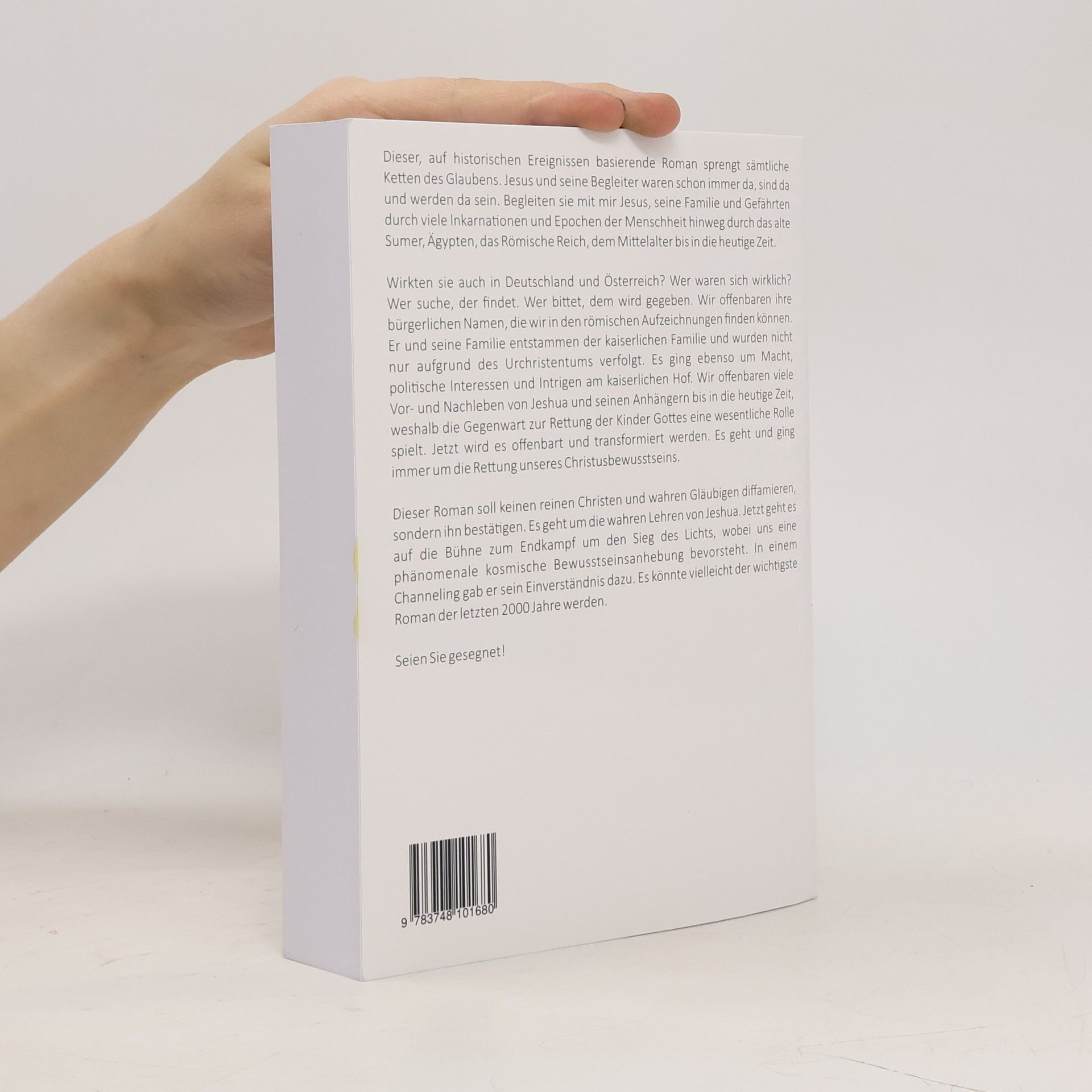 Dieser auf historischen Ereignissen basierende Roman sprengt sämtliche Ketten der Welt. Jesus und seine Begleiter waren schon immer da, sind da und werden sein. Begleiten Sie Jesus, seine Familie und Gefährten durch viele Inkarnationen und Epochen der Menschheit, von Sumer über Ägypten und das Römische Reich bis ins Mittelalter und die heutige Zeit. Wirken sie auch in Deutschland und Österreich? Wer sucht, der findet. Wir enthüllen ihre bürgerlichen Namen aus römischen Aufzeichnungen. Jesus und seine Familie stammen aus der kaiserlichen Familie und wurden nicht nur aufgrund des Urchristentums verfolgt, sondern auch wegen Macht, politischer Interessen und Intrigen am Hof. Viele Vor- und Nachleben von Jeshua und seinen Anhängern bis in die Gegenwart werden offenbart, wobei die Rettung der Kinder Gottes eine wesentliche Rolle spielt. Jetzt wird dies offenbart und transformiert. Es geht um die Rettung unseres Christusbewusstseins. Der Roman soll keinen reinen Christen diffamieren, sondern ihn bestätigen und die wahren Lehren von Jeshua vermitteln. Es steht ein Endkampf um den Sieg des Lichts bevor, begleitet von einer phänomenalen kosmischen Bewusstseinsanhebung. In einem Channeling gab er sein Einverständnis, und es könnte der wichtigste Roman der letzten 2000 Jahre werden. Seien Sie gesegnet!