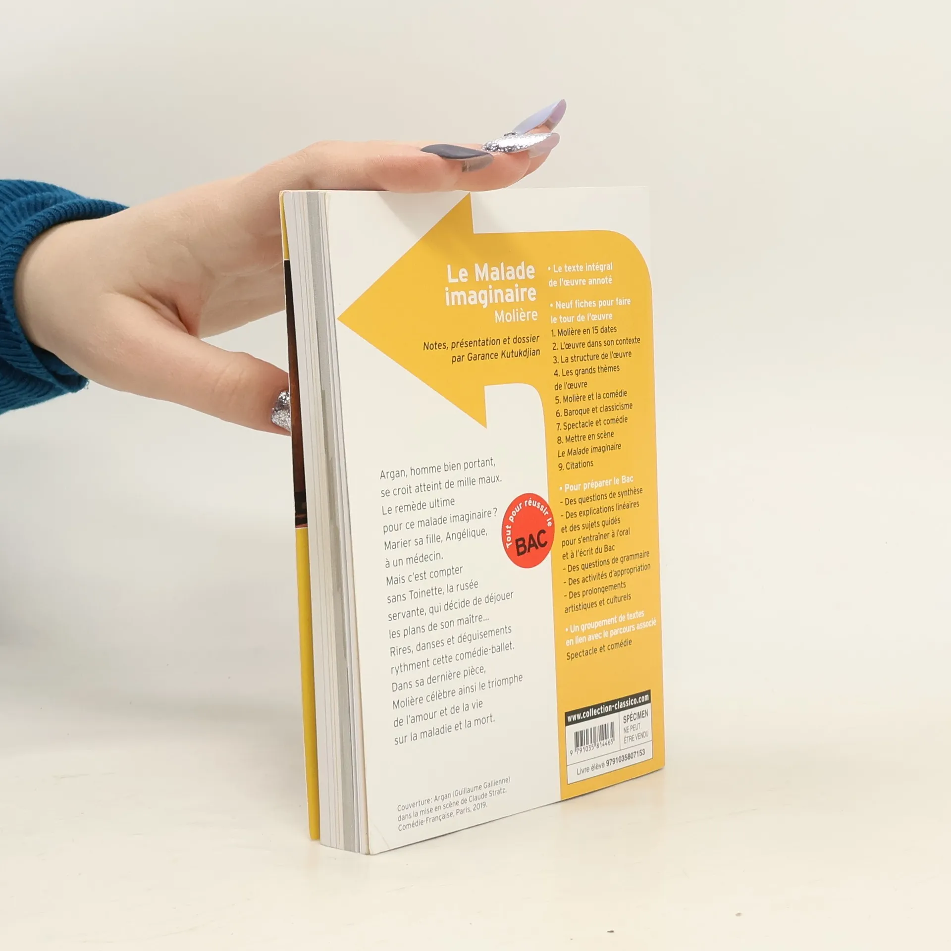 Argan, homme bien portant, se croit atteint de mille maux. Le remède ultime pour ce malade imaginaire ? Marier sa fille, Angélique, à un médecin. Mais c'est compter sans Toinette, la rusée servante, qui décide de déjouer les plans de son maître... Rires, danses et déguisements rythment cette comédie-ballet. Dans sa dernière pièce, Molière célèbre ainsi le triomphe de l'amour et de la vie sur la maladie et la mort [Source : site de l'éditeur].