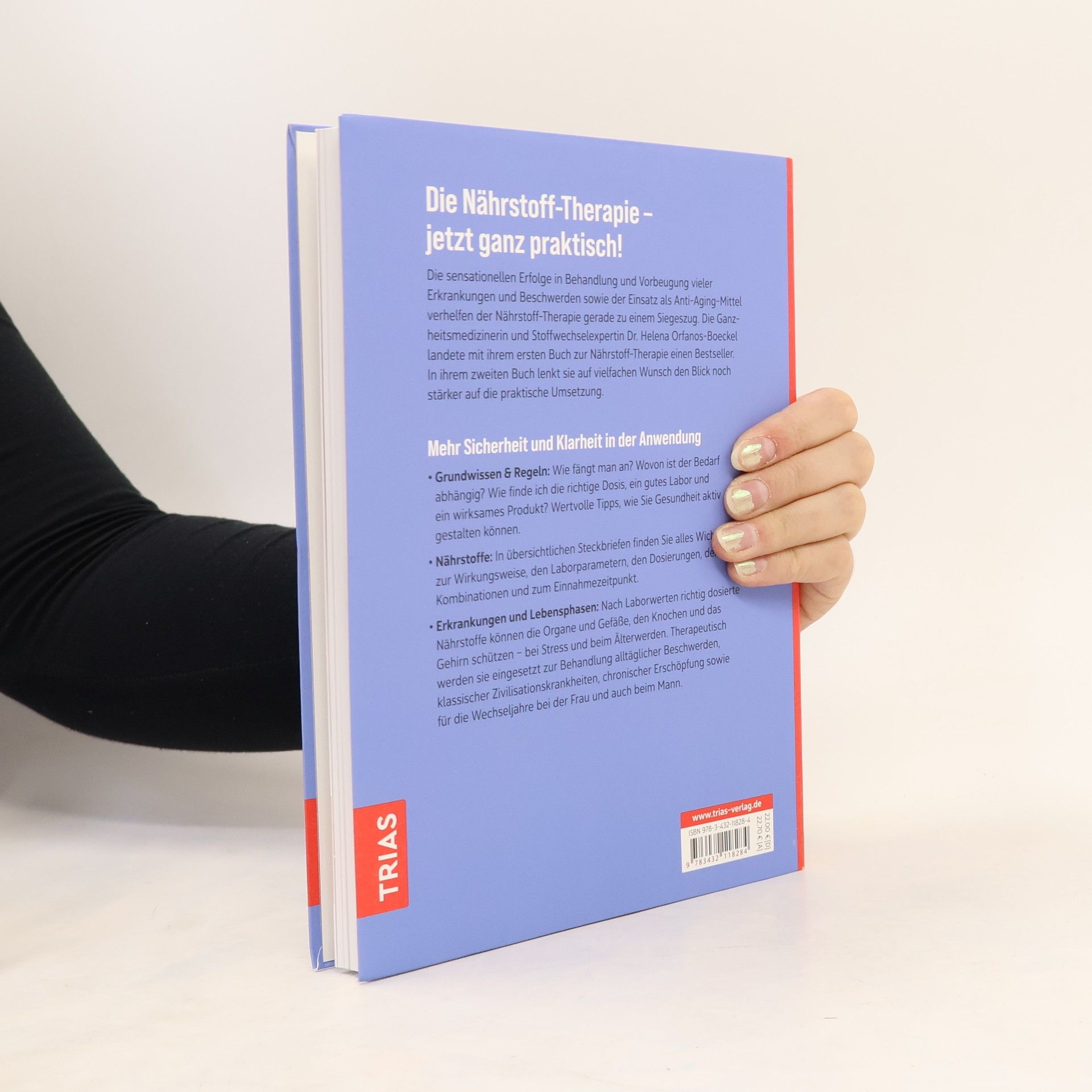 Die Nährstoff-Therapie – jetzt ganz praktisch! Die sensationellen Erfolge in Behandlung und Vorbeugung vieler Erkrankungen und Beschwerden und der Einsatz als Anti-Aging-Mittel verhelfen der Nährstoff-Therapie gerade zu einem Siegeszug. Die Ganzheitsmedizinerin und Stoffwechselexpertin Dr. Helena Orfanos-Boeckel landete mit ihrem ersten Buch zur Nährstoff-Therapie einen Bestseller. In ihrem zweiten Buch lenkt sie auf vielfachen Wunsch den Blick noch stärker auf die praktische Umsetzung. Mehr Sicherheit und Klarheit in der Anwendung Grundwissen & Regeln: Wie fängt man an? Wovon ist der Bedarf abhängig? Wie finde ich die richtige Dosis, ein gutes Labor und ein wirksames Produkt? Wertvolle Tipps, wie Sie Gesundheit aktiv gestalten können. Nährstoffe: In übersichtlichen Steckbriefen finden Sie alles Wichtige zur Wirkungsweise, den Laborparametern, den Dosierungen, den Kombinationen und zum Einnahmezeitpunkt. Erkrankungen und Lebensphasen: Nach Laborwerten richtig dosierte Nährstoffe können die Organe und Gefäße, den Knochen und das Gehirn schützen – bei Stress und beim Älterwerden. Therapeutisch werden sie eingesetzt zur Behandlung alltäglicher Beschwerden, klassischer Zivilisationskrankheiten, chronischer Erschöpfung sowie für die Wechseljahre bei Frau und auch beim Mann.