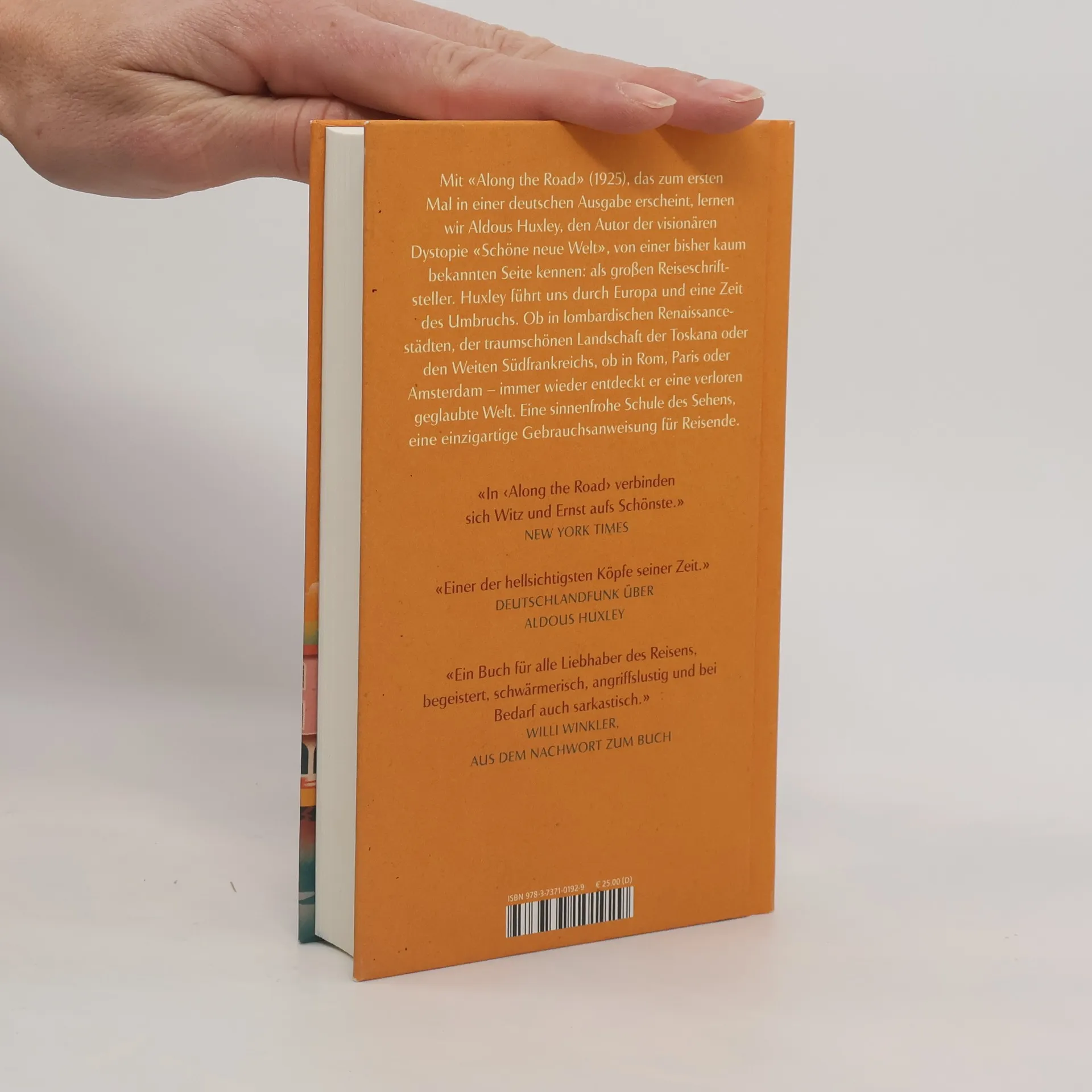 Mit «Along the Road» lernen wir Aldous Huxley, den Autor der visionären Dystopie «Schöne Neue Welt», von einer bisher kaum bekannten Seite kennen: als großen Reiseschriftsteller. Huxley führt uns durch das Europa der Zwanziger, eine Welt im Umbruch, in der eine neue Mobilität auf alte Formen des Reisens prallt. Auch Huxley erliegt dem Reiz der Geschwindigkeit, wenn er mit seinem 10-PS-Citroën in Oberitalien an kunsteifrigen deutschen Wandervögeln vorbeirauscht. Zugleich folgen wir einem humorvollen Flaneur, der im Zugabteil dritter Klasse den Geschichten der Menschen lauscht, sich mit großer Lust am Unerwarteten am liebsten von völlig veralteten Reiseführern durch Amsterdam, Paris oder Rom leiten lässt und einfach eine grün getönte Brille aufsetzt, wenn es den Weiten Südfrankreichs mal etwas an Frische fehlt. Er sucht nach verborgenen Kulturschätzen, ist auf den Spuren Brueghels oder Botticellis, in Konzerten oder Theatern, beim Pferderennen in Siena und an den Küsten Italiens. Und zwischen Elba, lombardischen Renaissancestädten und der traumschönen Landschaft der Toskana entdeckt er eine verloren geglaubte Welt. Eine sinnenfrohe Schule des Sehens, eine einzigartige Gebrauchsanweisung für Reisende.