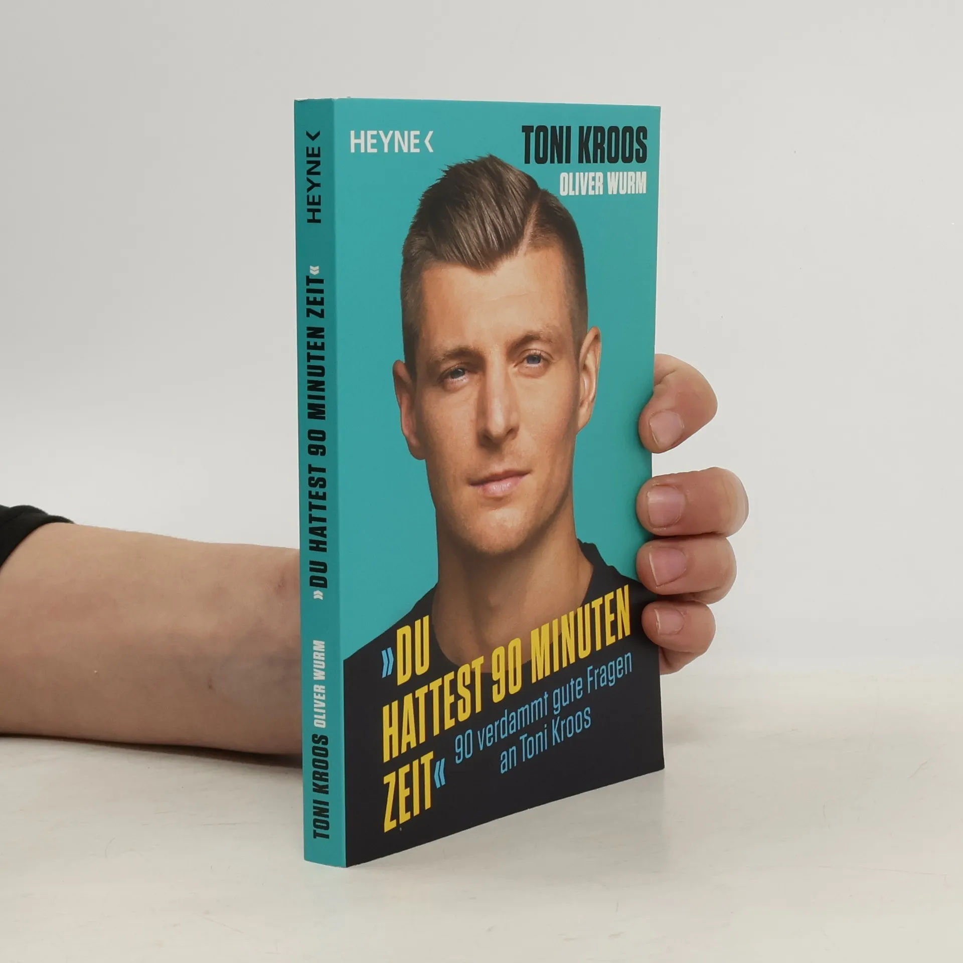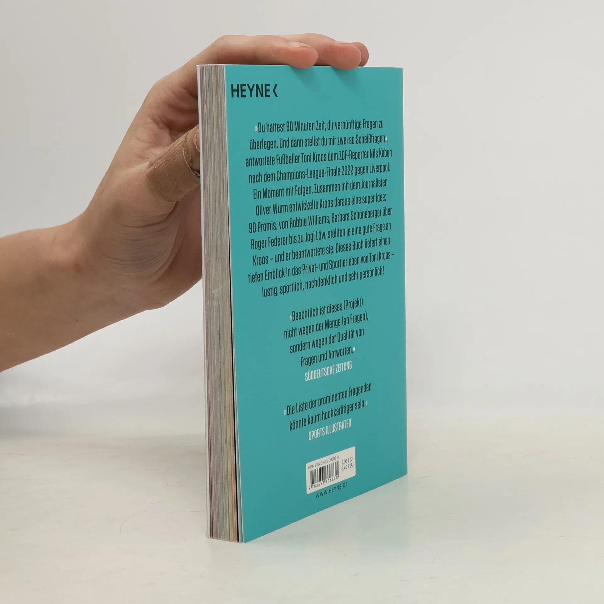 Kroos plaudert aus dem Nähkästchen »Du hattest 90 Minuten Zeit, dir vernünftige Fragen zu überlegen. Und dann stellst du mir zwei so Scheißfragen«, antwortete Fußballer Toni Kroos dem ZDF-Reporter Nils Kaben nach dem Champions-League-Finale 2022 gegen Liverpool. Ein Moment mit Folgen. Zusammen mit dem Journalisten Oliver Wurm entwickelte Kroos daraus eine super Idee: 90 Promis, von Robbie Williams, Barbara Schöneberger über Roger Federer bis zu Jogi Löw, stellten je eine gute Frage an Kroos – und er beantwortete sie. Dieses Buch liefert einen tiefen Einblick in das Privat- und Sportlerleben von Toni Kroos – lustig, sportlich, nachdenklich und sehr persönlich! Die etwas andere Fragerunde – Toni Kroos plaudert aus dem Nähkästchen 90 Fragen an Toni Kroos – gestellt von prominenten Persönlichkeiten wie Barbara Schöneberger, Jogi Löw, Judith Rakers, Robbie Williams Lustig, sportlich, nachdenklich, persönlich – Überraschende Einblicke in das Leben des Fußballstars Toni Kroos ist Deutschlands erfolgreichster Fußballer – mit über 36 Millionen Followern auf Instagram Ausstattung: durchg. 4c, Fotos