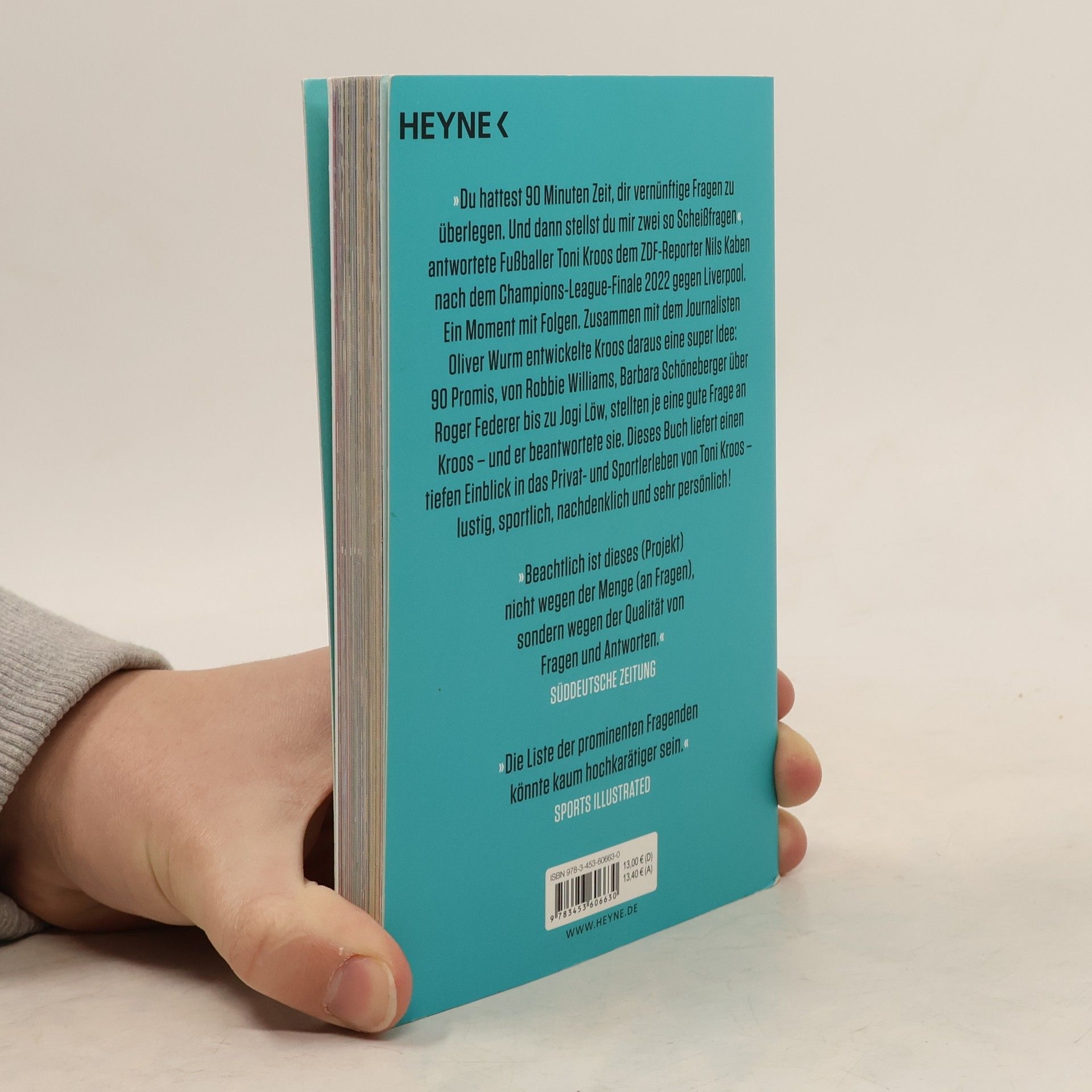 Kroos plaudert aus dem Nähkästchen »Du hattest 90 Minuten Zeit, dir vernünftige Fragen zu überlegen. Und dann stellst du mir zwei so Scheißfragen«, antwortete Fußballer Toni Kroos dem ZDF-Reporter Nils Kaben nach dem Champions-League-Finale 2022 gegen Liverpool. Ein Moment mit Folgen. Zusammen mit dem Journalisten Oliver Wurm entwickelte Kroos daraus eine super Idee: 90 Promis, von Robbie Williams, Barbara Schöneberger über Roger Federer bis zu Jogi Löw, stellten je eine gute Frage an Kroos – und er beantwortete sie. Dieses Buch liefert einen tiefen Einblick in das Privat- und Sportlerleben von Toni Kroos – lustig, sportlich, nachdenklich und sehr persönlich! Die etwas andere Fragerunde – Toni Kroos plaudert aus dem Nähkästchen 90 Fragen an Toni Kroos – gestellt von prominenten Persönlichkeiten wie Barbara Schöneberger, Jogi Löw, Judith Rakers, Robbie Williams Lustig, sportlich, nachdenklich, persönlich – Überraschende Einblicke in das Leben des Fußballstars Toni Kroos ist Deutschlands erfolgreichster Fußballer – mit über 36 Millionen Followern auf Instagram Ausstattung: durchg. 4c, Fotos