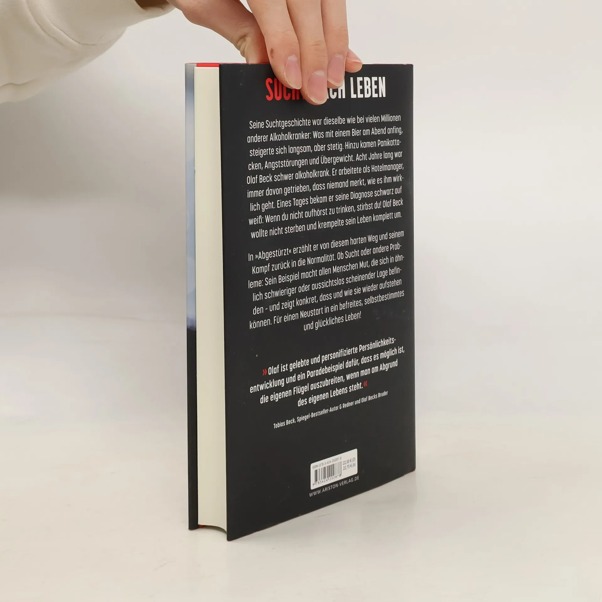 Seine Suchtgeschichte war dieselbe wie bei vielen Millionen anderer Alkoholkranker: Was mit einem Bier am Abend anfing, steigerte sich langsam, aber stetig. Hinzu kamen Panikattacken, Angststörungen und Übergewicht. Acht Jahre lang war Olaf Beck schwer alkoholkrank. Er arbeitete als Hotelmanager, immer davon getrieben, dass niemand merkt, wie es ihm wirklich geht. Eines Tages bekam er seine Diagnose schwarz auf weiß: Wenn du nicht aufhörst zu trinken, stirbst du! Olaf Beck wollte nicht sterben, sondern leben, und krempelte sein Leben komplett um. In »Abgestürzt« erzählt er von diesem harten Weg und seinem Kampf zurück in die Normalität. Ob Sucht oder andere Probleme: Sein Beispiel macht allen Menschen Mut, die sich in ähnlich schwieriger oder aussichtslos scheinender Lage befinden – und zeigt konkret, dass und wie sie wieder aufstehen können. Für einen Neustart in ein befreites, selbstbestimmtes und glückliches Leben! Offen, authentisch und schonungslos ehrlich: Olaf Becks Weg durch die Hölle und wieder zurück Er hat Schluss gemacht mit Alkoholsucht, Angststörungen und siebzig Kilo Übergewicht Motivation pur! – Der Autor erklärt, wie man seinem Leben nach der Sucht einen neuen Sinn gibt und wieder erfolgreich wird