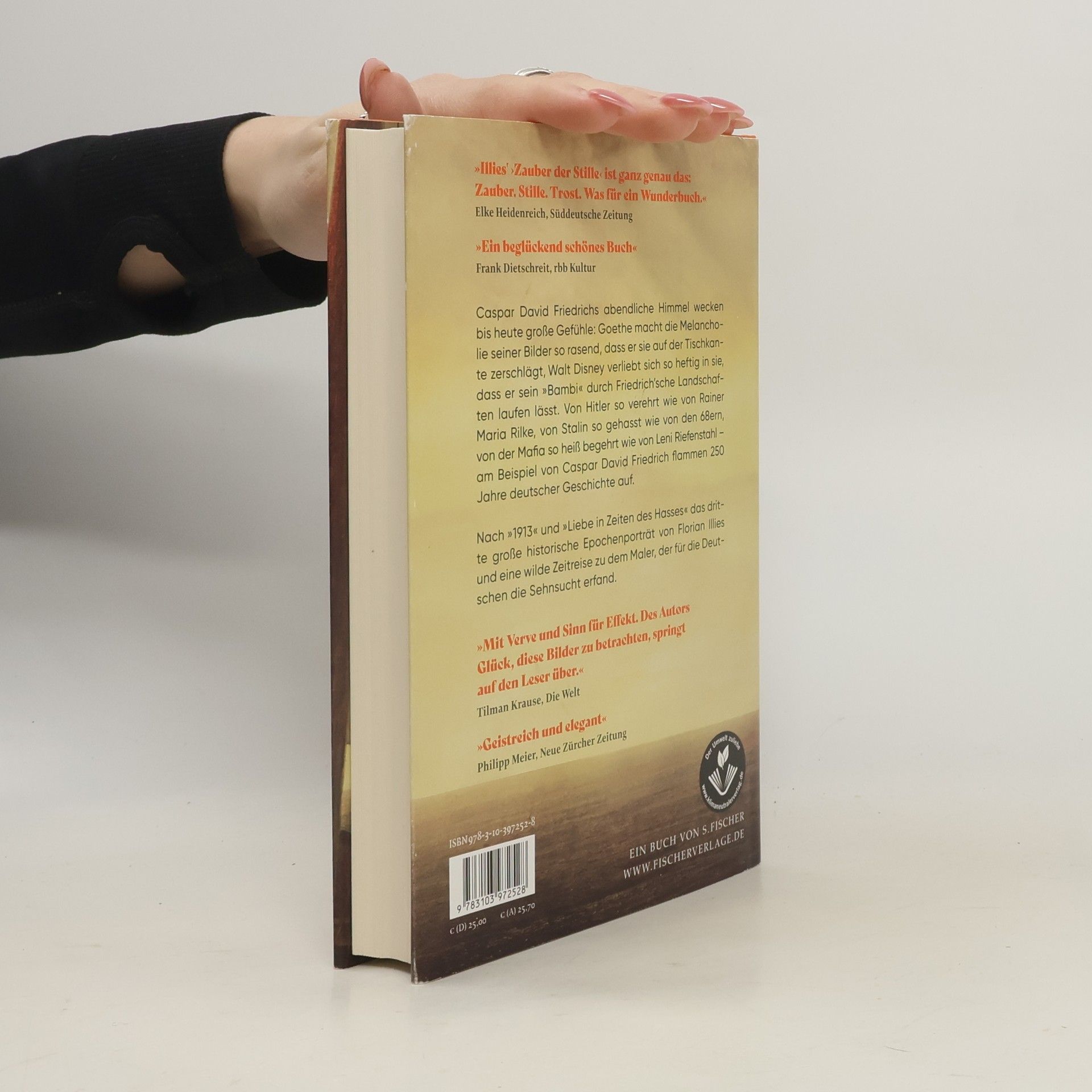»So elegant und mühelos erzählt. Dieses neue Buch von Florian Illies zu lesen, ist wie einen Billy-Wilder-Film zu schauen – einfach großartig.« Ferdinand von Schirach Mit Florian Illies kann man Vergangenheit plötzlich als Gegenwart erleben. In »Zauber der Stille« breitet er erstmals die abenteuerlichen Geschichten Caspar David Friedrichs vor uns aus. Eine wilde Zeitreise zu dem Mann, der für die Deutschen die Sehnsucht erfand. Friedrichs abendliche Himmel wecken seit Jahrhunderten die leidenschaftlichsten Gefühle: Goethe macht ihre Melancholie so rasend, dass er sie auf der Tischkante zerschlagen will, Walt Disney hingegen verliebt sich so heftig in sie, dass er sein »Bambi« nur durch Friedrich'sche Landschaften laufen lässt. Von Hitler so verehrt wie von Rainer Maria Rilke, von Stalin so gehasst wie von den 68ern, von der Mafia so heiß begehrt wie von Leni Riefenstahl – am Beispiel von Caspar David Friedrich werden in diesem mitreißend erzählten Buch 250 Jahre deutscher Geschichte sichtbar. Und Friedrich, der Maler, wird zu einem Menschen aus Fleisch und Blut. Nach »1913« und »Liebe in Zeiten des Hasses« das dritte große historische Epochenportrait von Florian Illies.