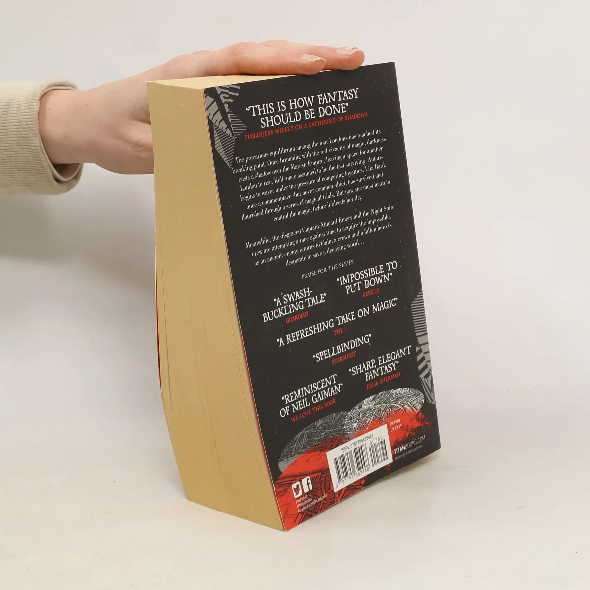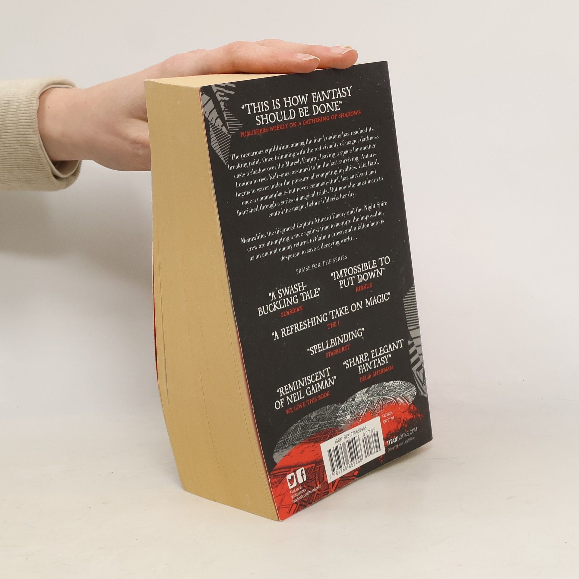 The precarious equilibrium among the four Londonc has reached its breaking point. Once brimming with the red vivacity of magic ; darkness casts a sshadow over the Maresh Empire, leaving a space for another London to rise. Kell - once assumed to he the last surviving Antari - begins to waver under the pressure of competing loyalities. Lila Bard, once a commonplace - but never common - thief, has survived and flourished through a series of magical trials. But now she must learn to control the magic, before it bleeds her dry. Meanwhile, the disgraced Captain Alucard Emery and the Night Spire crew are attempting a race against time to acquire the impossible, as an ancient enemy returns to claim a crown and a fallen hero is desperate to save a decaying world...