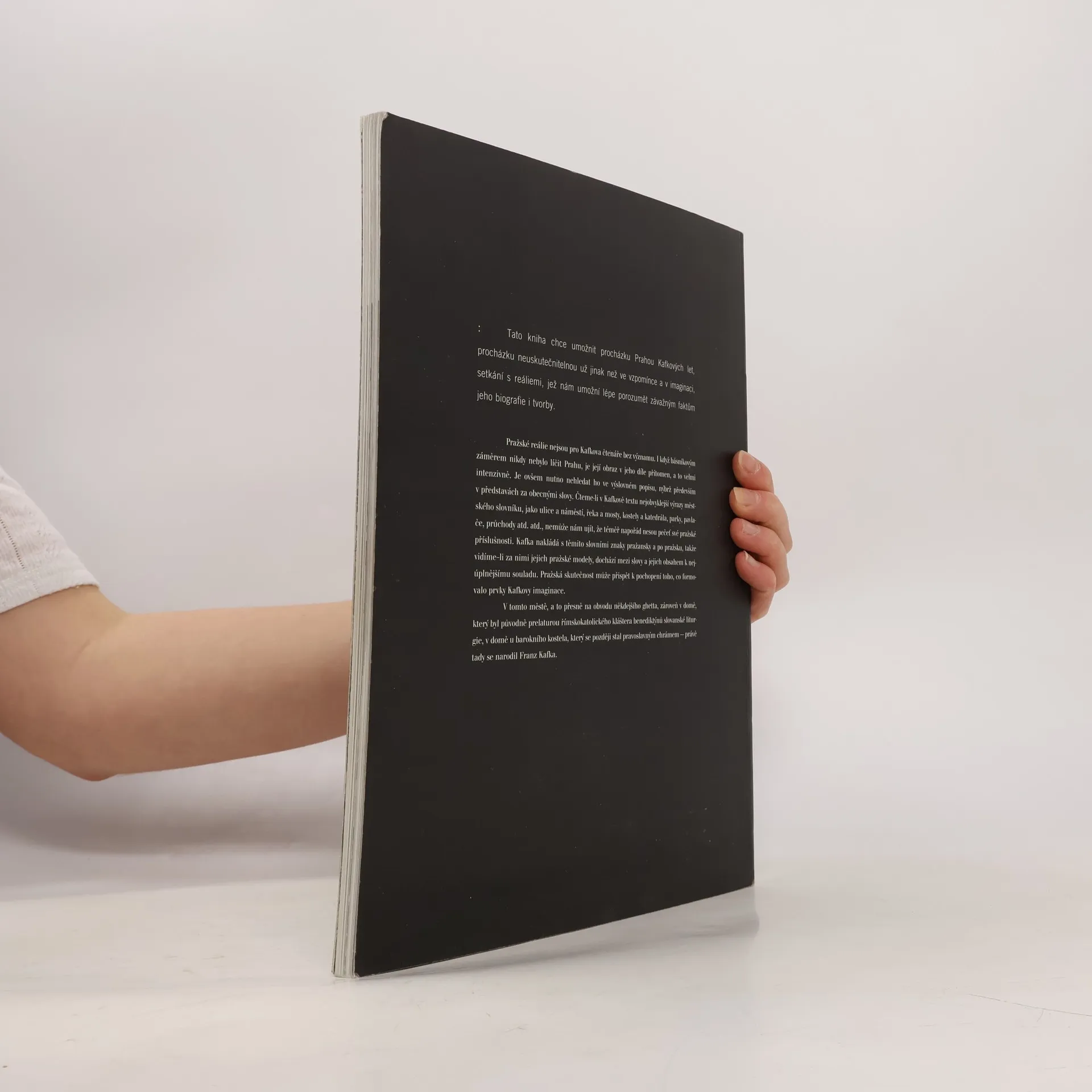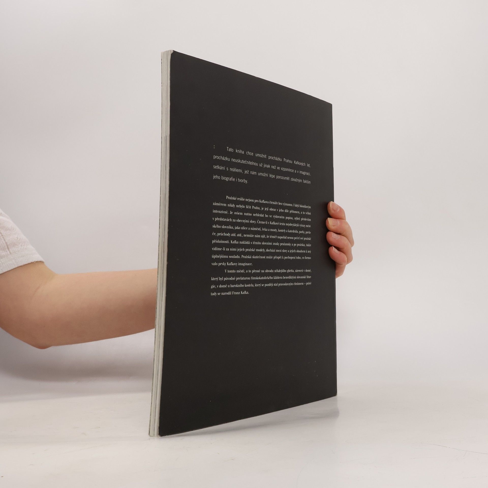 Tato kniha chce umožnit procházku Prahou Kafkových let, procházku neuskutečnitelnou už jinak než ve vzpomínce a v imaginaci, setkání s reáliemi, jež nám umožní lépe porozumět závažným faktům jeho biografie i tvorby. Fotografie Jan Lukas.