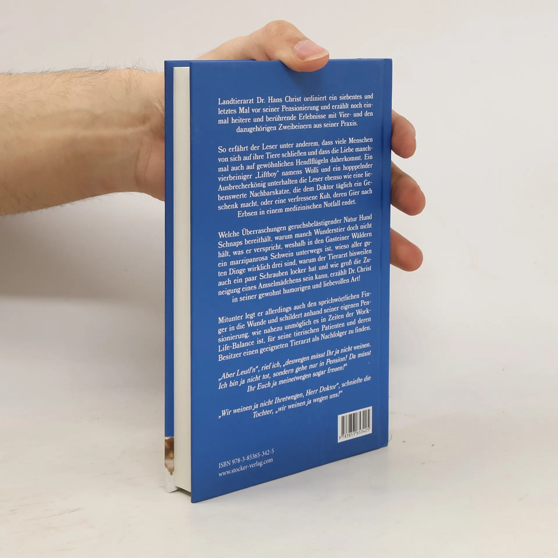 Auch in seinem mittlerweile siebten Band mit heiteren Tiergeschichten präsentiert sich der Salzburger Tierarzt Dr. Hans Christ wieder als würdiger Nachfolger des beliebten Fernsehtierarztes Dr. James Herriot. Für beide gilt: Oft sind es nicht nur die Tiere, die der tierärztlichen Behandlung bedürfen, sondern auch deren Besitzer benötigen häufig Rat, Unterstützung und Zuwendung des Doktors. Die Erlebnisse des österreichischen Landtierarztes werden eindeutig dem alten Journalistenmotto gerecht: Die besten Geschichten schreibt das Leben selbst.