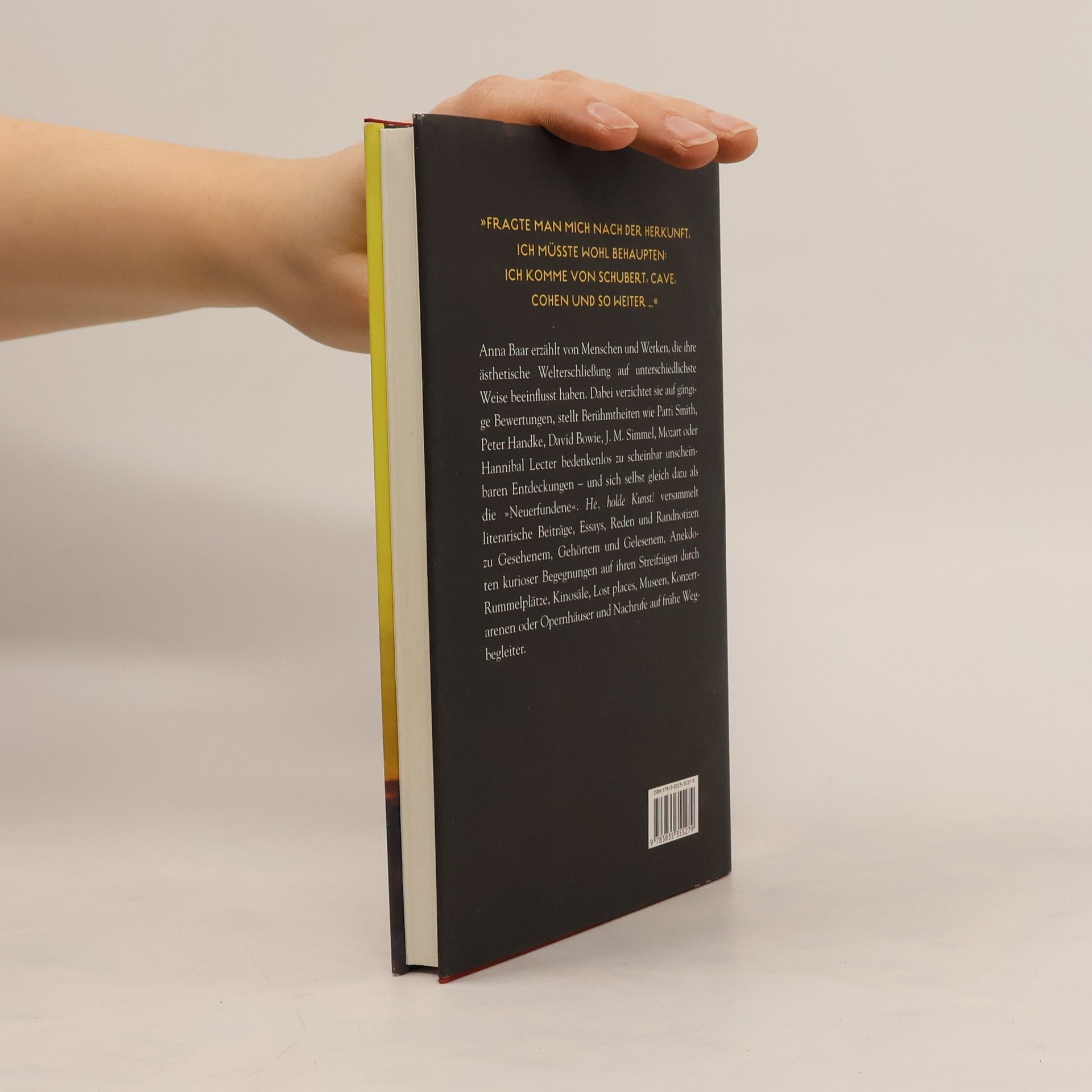 »Fragte man mich nach der Herkunft, ich sagte: Ich komme von Schubert, Cave, Cohen und so weiter …« Anna Baar erzählt von Menschen und Werken, die ihre ästhetische Welterschließung auf unterschiedlichste Weise beeinflusst haben. »He, holde Kunst!« versammelt Randnotizen und literarische Beiträge zu Gesehenem, Gehörtem und Gelesenem, Anekdoten mitunter kurioser Begegnungen auf ihren Streifzügen durch Rummelplätze, Kinosäle, Bedürfnisanstalten, Spelunken, Museen, Konzertarenen und Opernhäuser, Überlegungen zu Rezeption und Kritik und Nachrufe auf frühe Wegbegleiter. Dabei verzichtet sie auf gängige Bewertungen, stellt Berühmtheiten wie Patti Smith, Peter Handke, David Bowie, J. M. Simmel, Mozart oder Hannibal Lecter bedenkenlos zu scheinbar Unscheinbaren - und sich selbst gleich dazu. Was sie bei den anderen findet, verknüpft sie mit Persönlichem, erzählt von Ablenkungen und Umschweifen auf dem eigenen Weg, vom Wundernehmen und Stutzen, etwa der lieben Not mit Galeriebesuchen, tröstlichen Moritaten und schweigsamen Geliebten, die aus Liedern sprechen. Kunst nicht als das, was scheint, sondern was in uns anklingt …