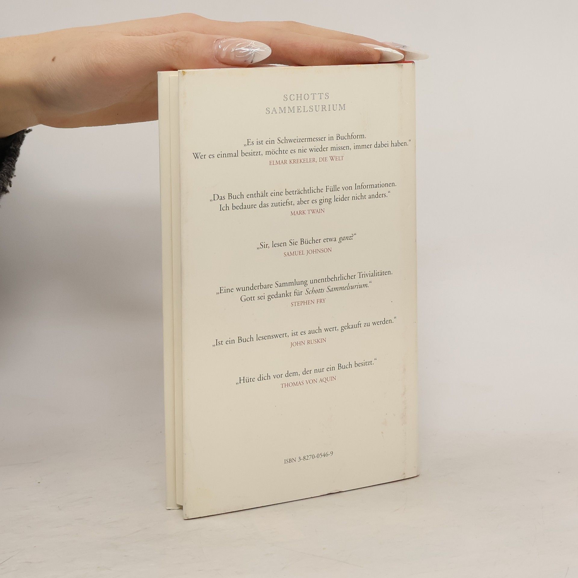 „Ben Schott ist ein Sammler von (scheinbaren) Nutzlosigkeiten: von kuriosen Statistiken, Klassifikationen, Hierarchien, Kategorien, Formaten, Bezeichnungen, Zitaten, Fachausdrücken, Namen, Definitionen, Abkürzungen, Größen, Symbolen, Phobien, Nomenklaturen und vielen anderen Merkwürdigkeiten. Ein Gemeinplatz, ein Potpourri, ein Mischmasch, ein Lexikon, ein Vademekum, ein Sammelsurium.“