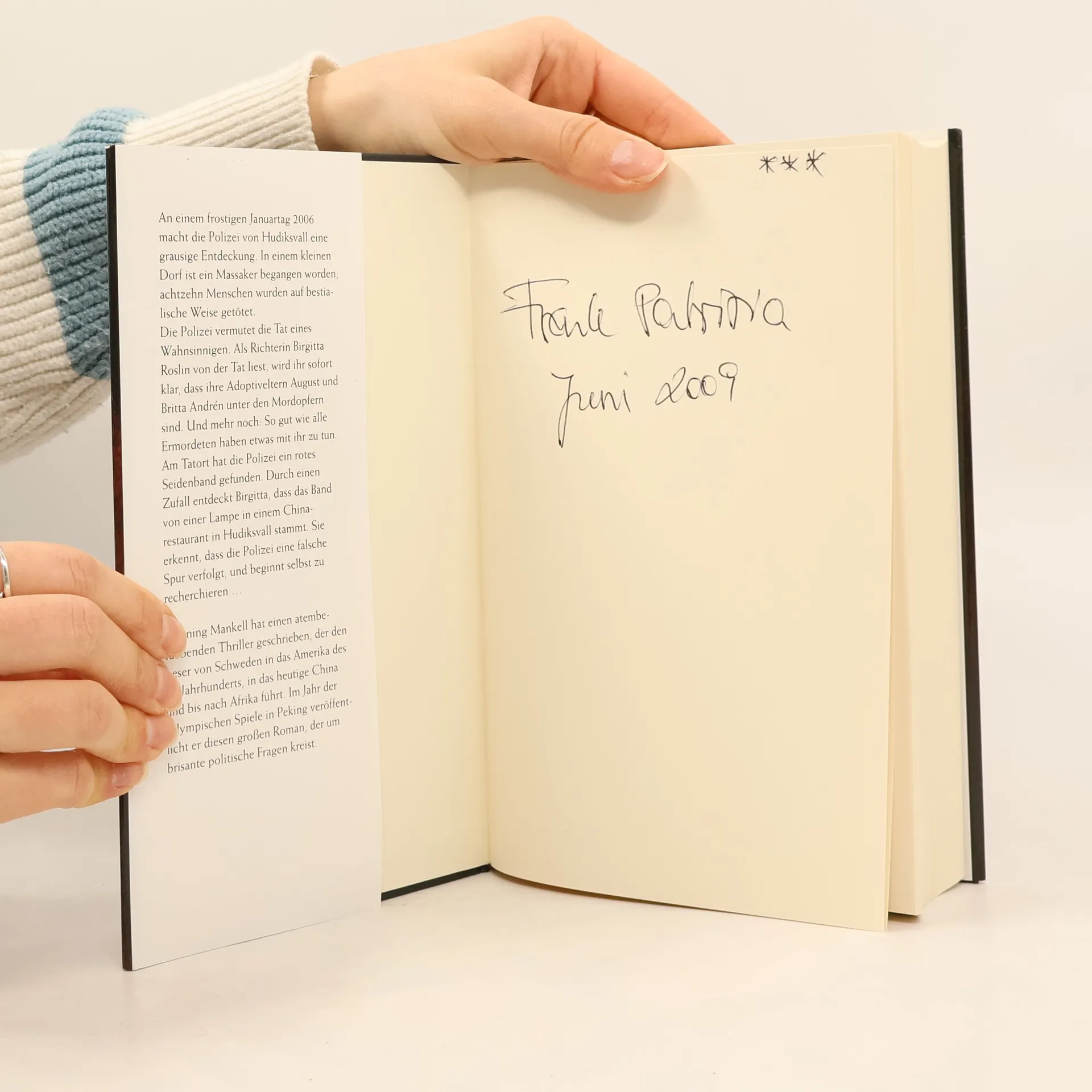 Die schwedische Polizei macht eine entsetzliche Entdeckung. In einem kleinen Dorf sind neunzehn Menschen auf bestialische Weise ermordet worden. Die Polizei vermutet dahinter die Tat eines Wahnsinnigen. Als Richterin Birgitta Roslin von der Tat erfährt, ist ihr sofort klar, dass ihre Eltern unter den Mordopfern sind. Mehr noch: Sie erkennt, dass die Polizei eine falsche Spur verfolgt, und beginnt selbst zu recherchieren. Die Spur führt nach China.