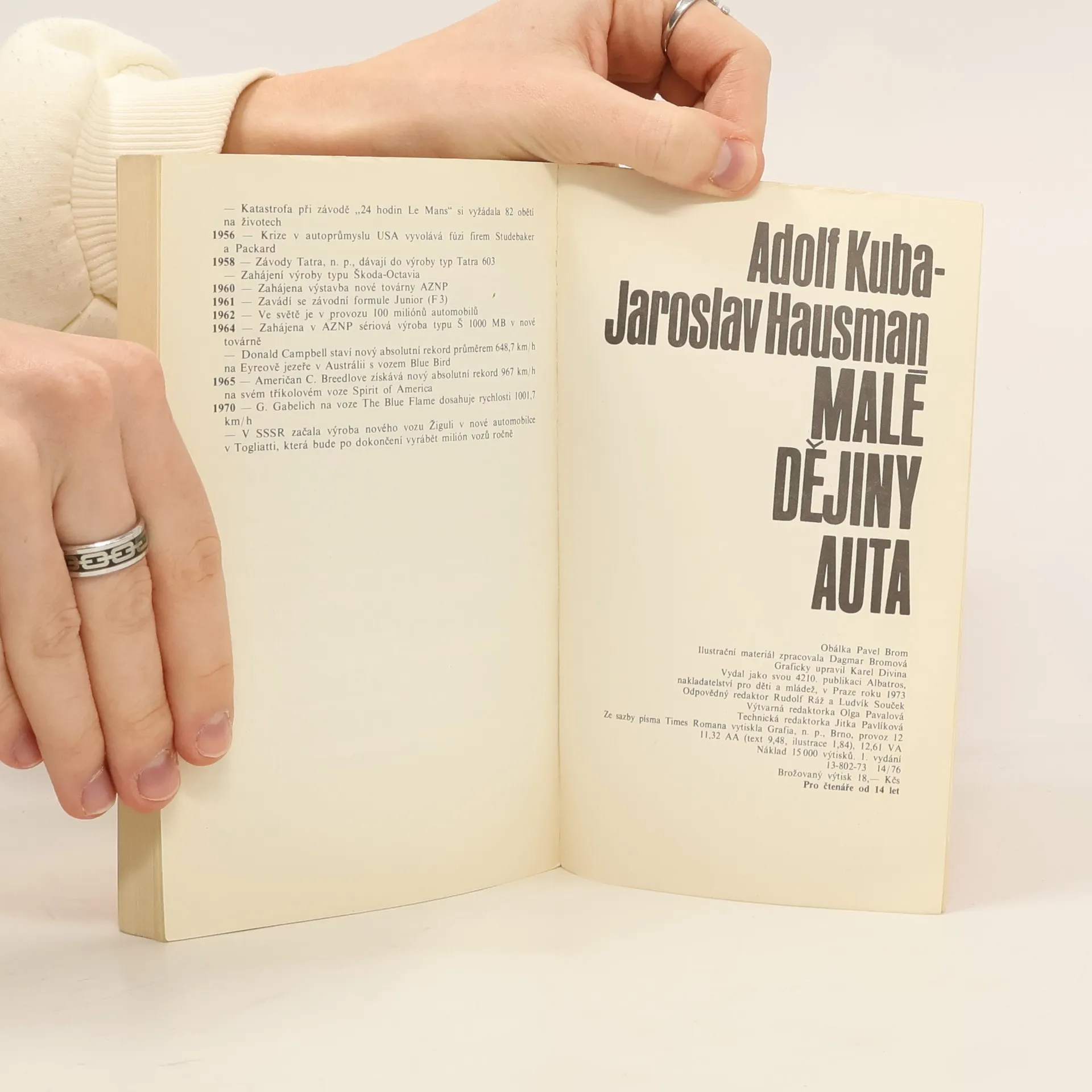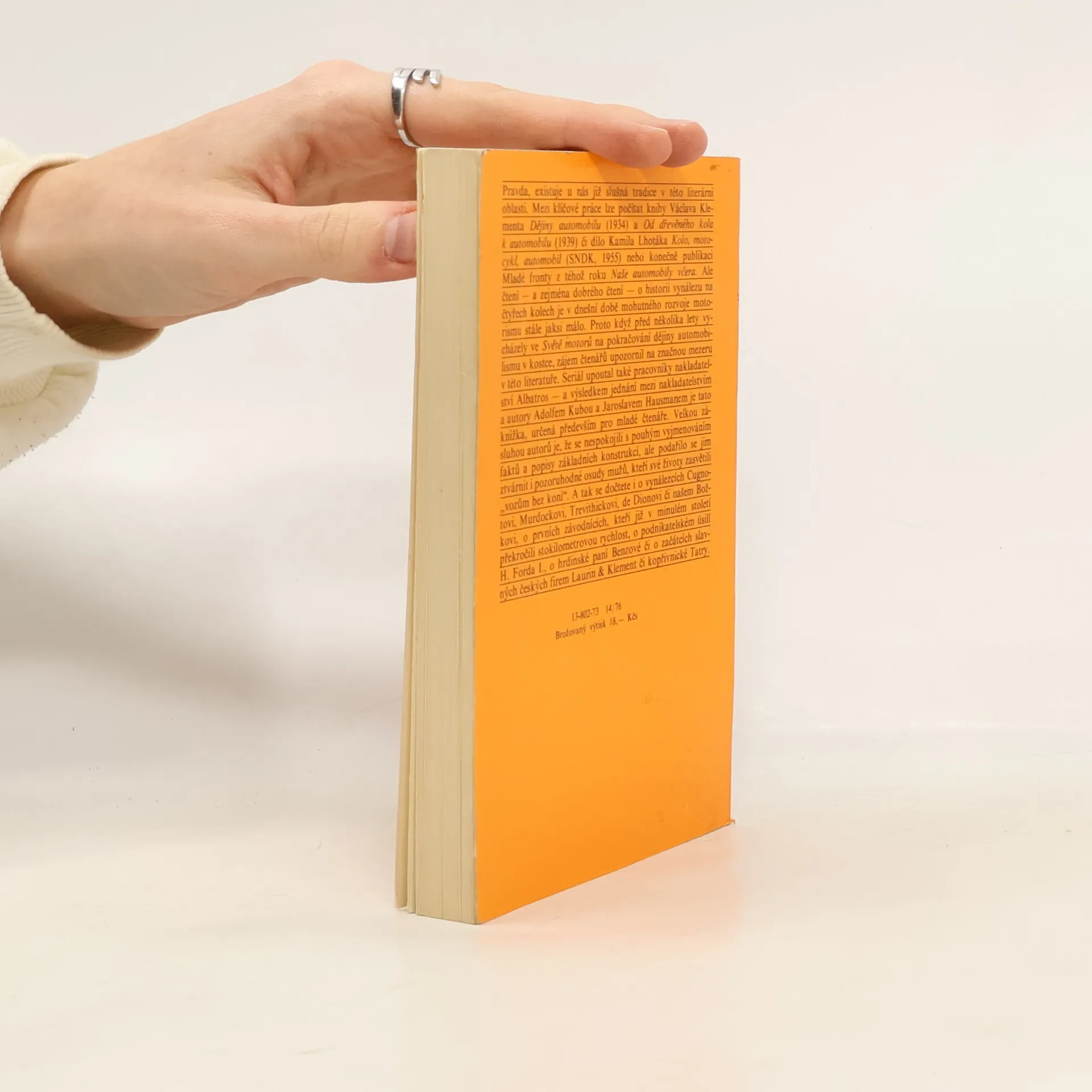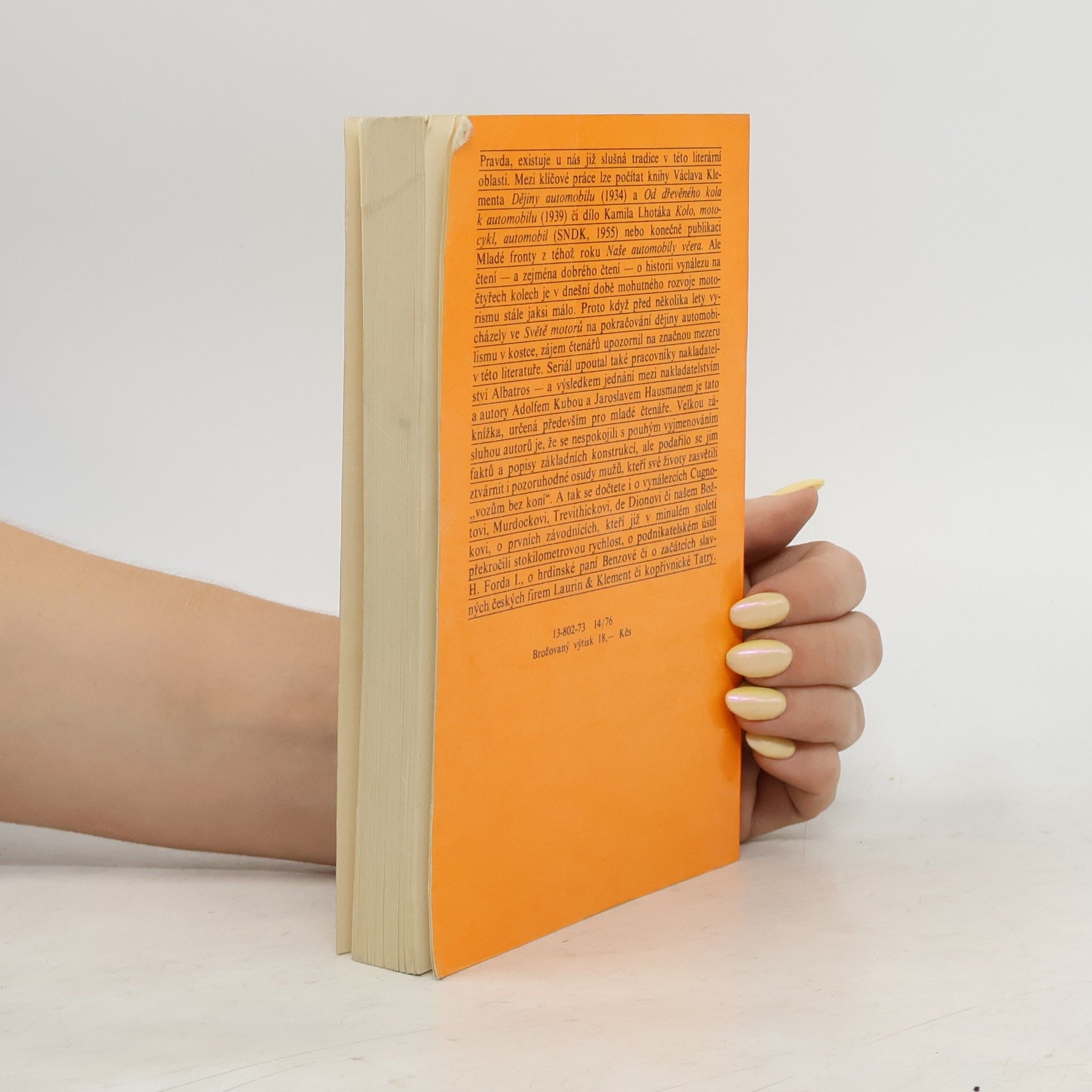 Populární dějiny automobilu, určené především mládeži, poutavým způsobem seznamují s hlavními vývojovými mezníky tohoto dopravního prostředku. Knížka však není pouze historií různých konstrukcí automobilu, ale vypráví také oosudech jeho tvůrců, o automobilových závodech a o vznikua soupeření velkých továren na výrobu automobilů v zahraničí i u nás. Přehled významných dat z dějin automobilismu, připojený na konci knihy, je doveden až do r. 1970.