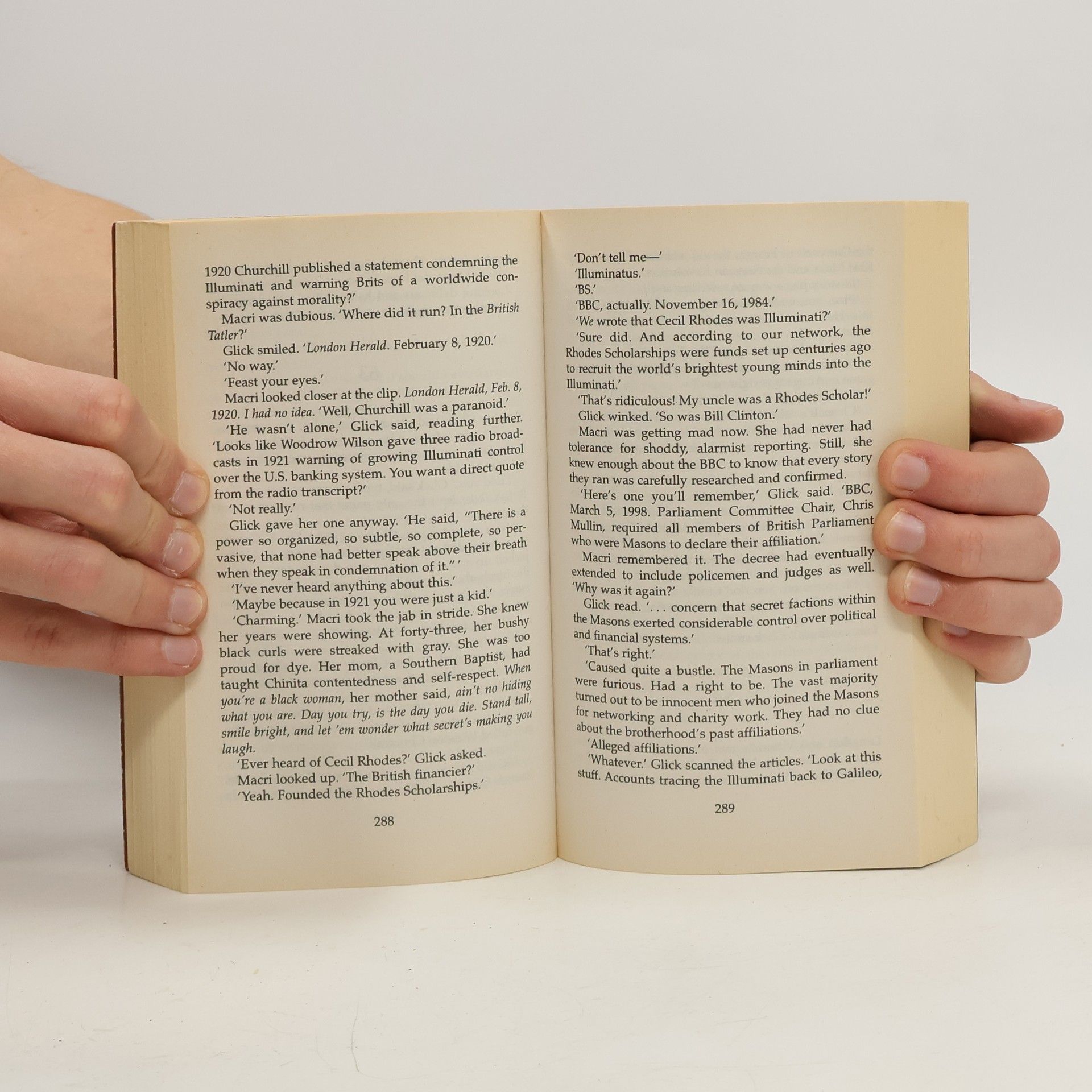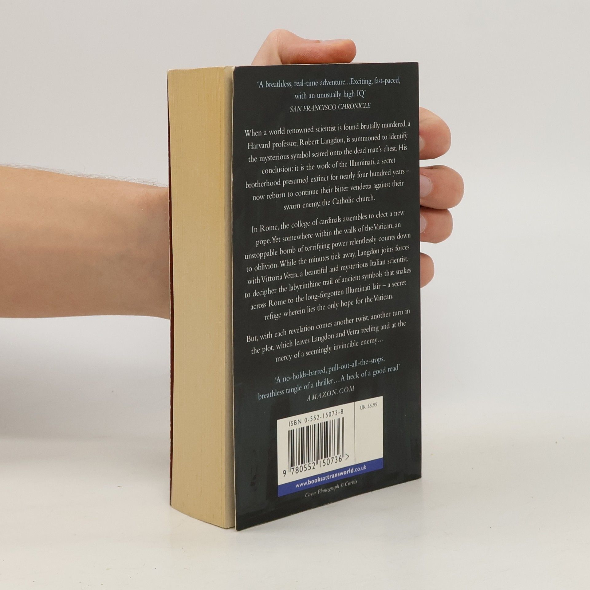 When a world renowned scientist is found brutally murdered in a Swiss research facility, a Harvard professor, Robert Langdon, is summoned to identify the mysterious symbol seared onto the dead man's chest. His baffling conclusion: it is the work of the Illuminati, a secret brotherhood presumed extinct for nearly four hundred years - reborn to continue their bitter vendetta against their sworn enemy, the Catholic church. In Rome, the college of cardinals assembles to elect a new pope. Yet somewhere within the walls of the Vatican, an unstoppable bomb of terrifying power relentlessly counts down to oblivion. While the minutes tick away, Langdon joins forces with Vittoria Vetra, a beautiful and mysterious Italian scientist, to decipher the labyrinthine trail of ancient symbols that snakes across Rome to the long-forgotten Illuminati lair - a secret refuge wherein lies the only hope for the Vatican. But with each revelation comes another twist, another turn in the plot, which leaves Langdon and Vetra reeling and at the mercy of a seemingly invisible enemy... --back cover