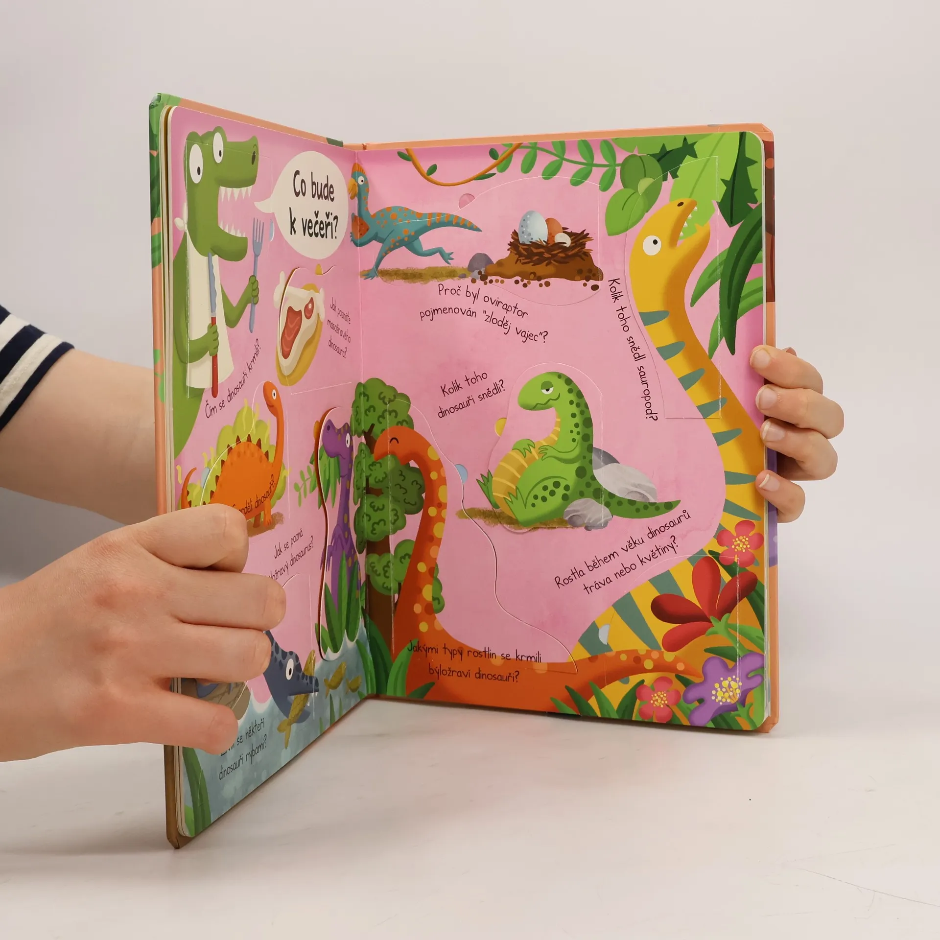 Který dinosaurus byl největší? Jsou kuřata z části dinosauři? Pod odklápěcími obrázky se skrývají odpovědi nejen na tyto, ale i na mnohé další zajímavé otázky o dinosaurech. Poznávejte svět druhohor odpověď za odpovědí s touto velkou a zábavnou knihou o dinosaurech.
