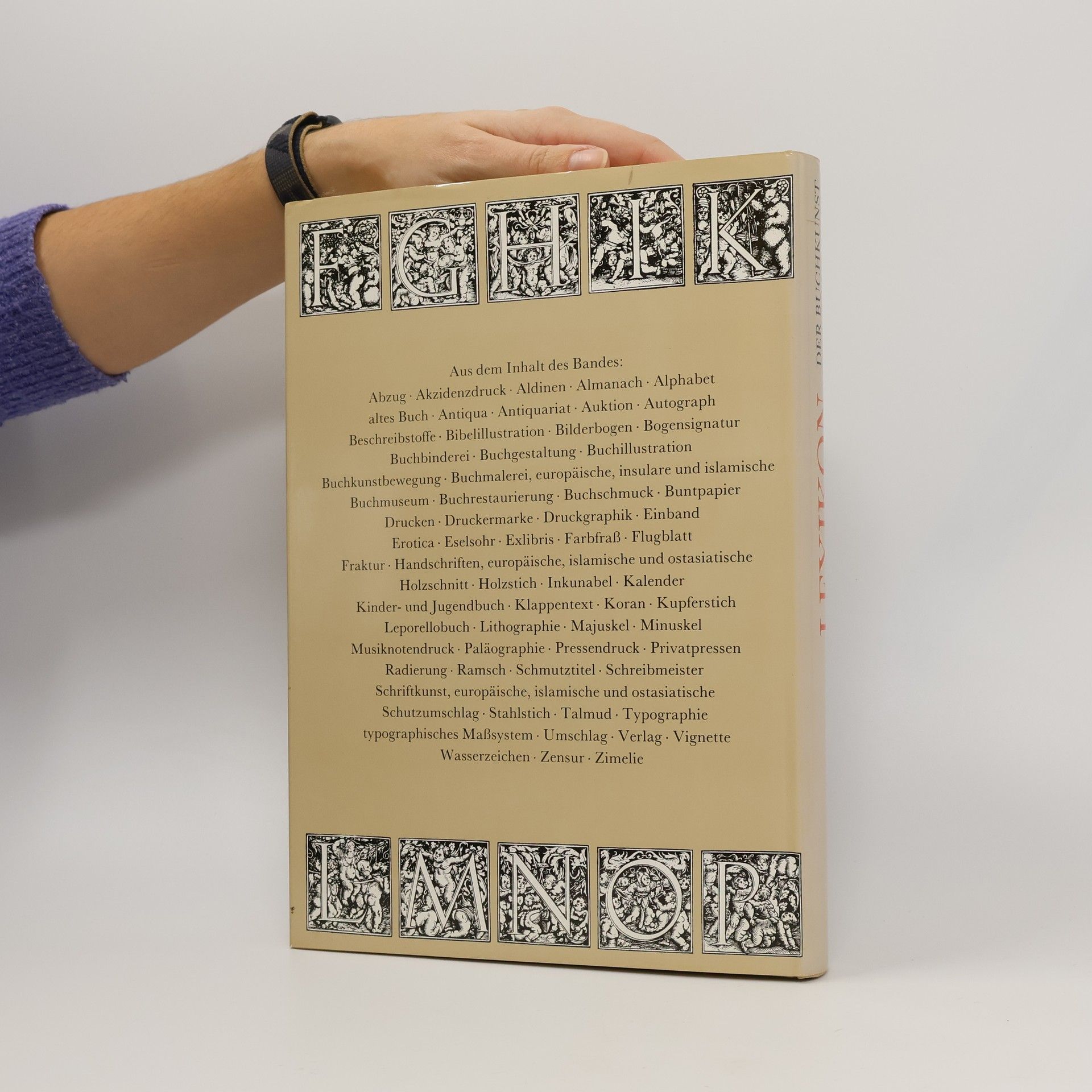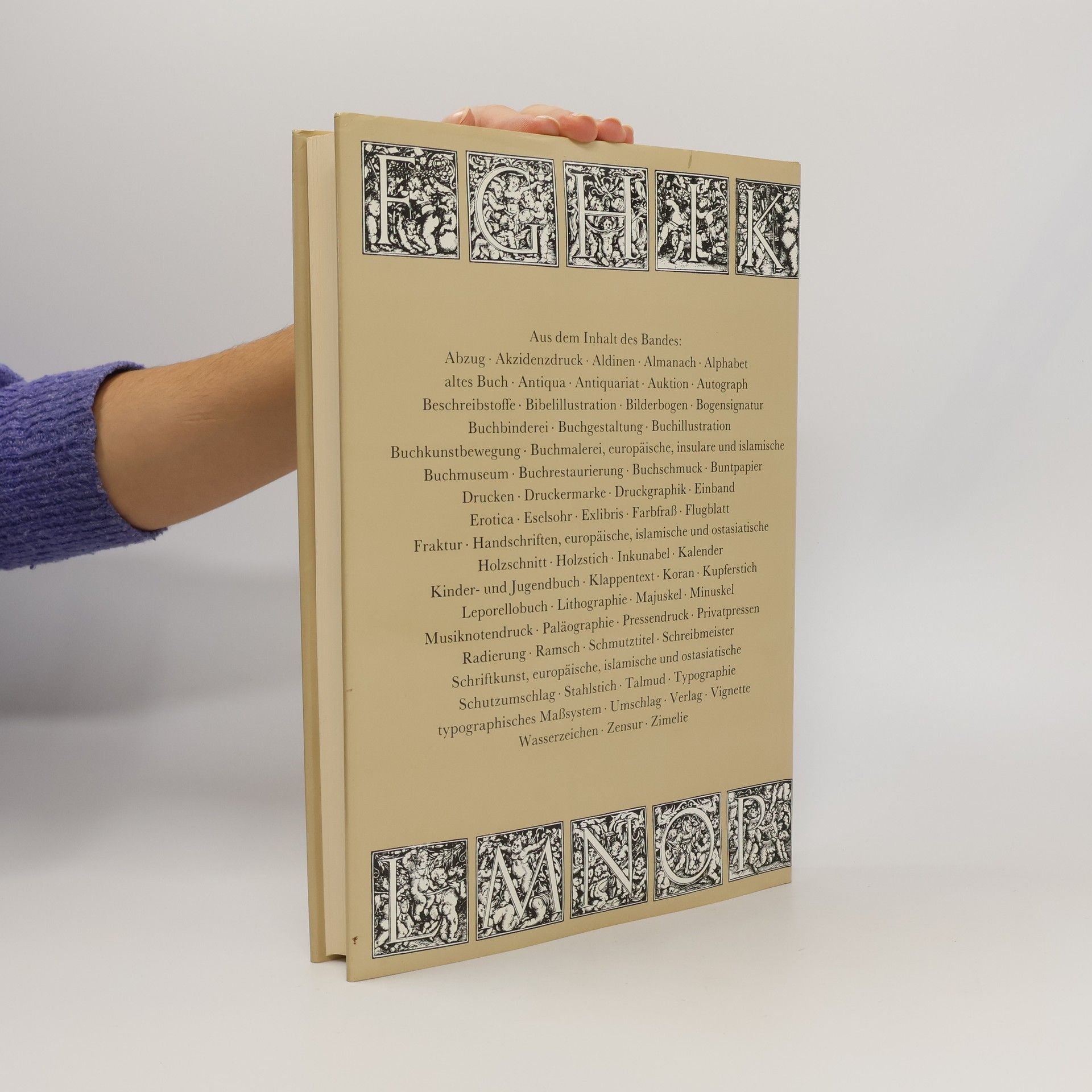 Aus dem Inhalt: Abzug • Akzidenzdruck • Aldinen • Almanach • Alphabet • altes Buch • Antiqua • Antiquariat • Auktion • Autograph • Beschreibstoffe • Bibelillustration • Bilderbogen • Bogensignatur • Buchbinderei • Buchgestaltung • Buchillustration • Buchkunstbewegung • Buchmalerei, europäische, insulare und islamische • Buchmuseum • Buchrestaurierung • Buchschmuck • Buntpapier • Drucken • Druckermarke • Druckgraphik • Einband • Erotica • Eselohr • Exlibris • Farbfrass • Flugblatt • Fraktur • Handschriften, europäische, islamische und ostasiatische • Holzschnitt • Holzstich • Inkunabel • Kalender • Kinder- und Jugendbuch • Klappentext • Koran • Kupferstich • Leporellobuch • Lithographie • Majuskel • Minuskel • Musiknotendruck • Paläographie • Pressendruck • Privatpressen • Radierung • Ramsch • Schmutztitel • Schreibmeister • Schriftkunst, europäische, islamische und ostasiatische • Schutzumschlag • Stahlstich • Talmud • Typographie • typographisches Mass-System • Umschlag • Verlag • Vignette • Wasserzeichen • Zensur • Zimelie