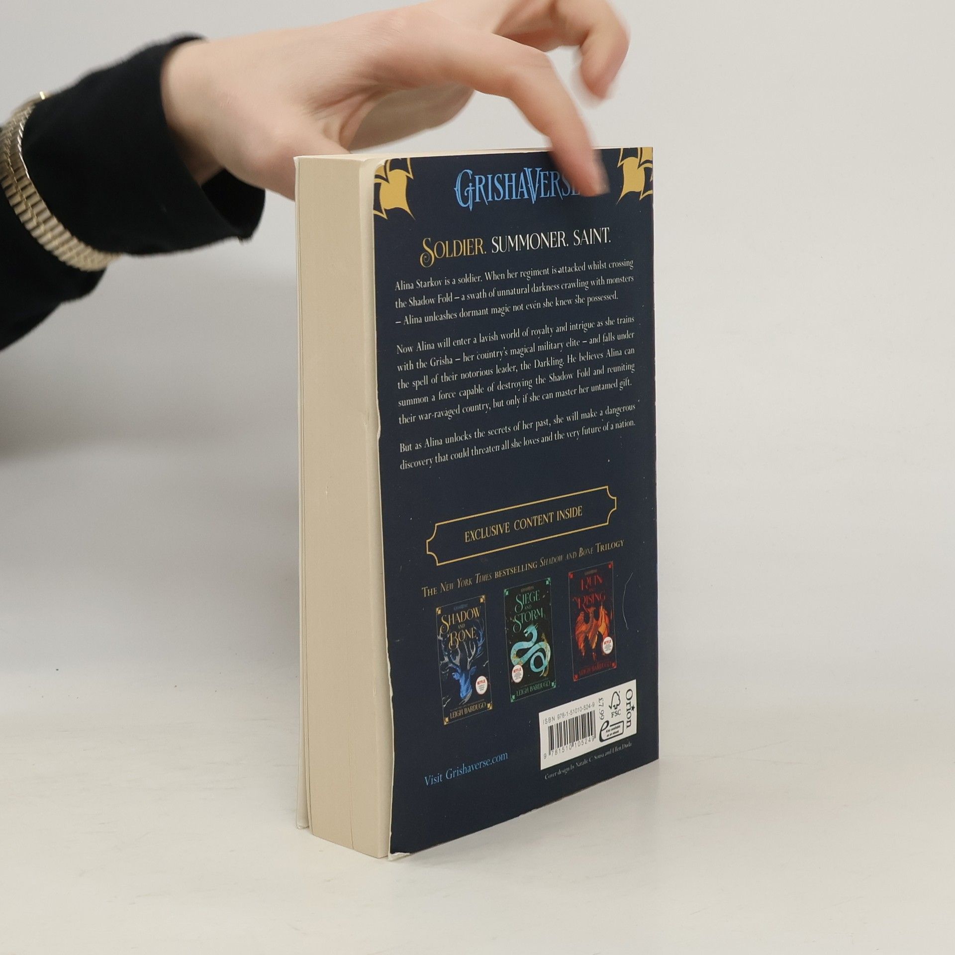 Soldier. Summoner. Saint. Orphaned and expendable, Alina Starkov is a soldier who knows she may not survive her first trek across the Shadow Fold - a swath of unnatural darkness crawling with monsters. But when her regiment is attacked, Alina unleashes dormant magic not even she knew she possessed. Now Alina will enter a lavish world of royalty and intrigue as she trains with the Grisha, her country's magical military elite - and falls under the spell of their notorious leader, the Darkling. He believes Alina can summon a force capable of destroying the Shadow Fold and reuniting their war-ravaged country, but only if she can master her untamed gift. As the threat to the kingdom mounts and Alina unlocks the secrets of her past, she will make a dangerous discovery that could threaten all she loves and the very future of a nation. Welcome to Ravka . . . a world of science and superstition where nothing is what it seems.