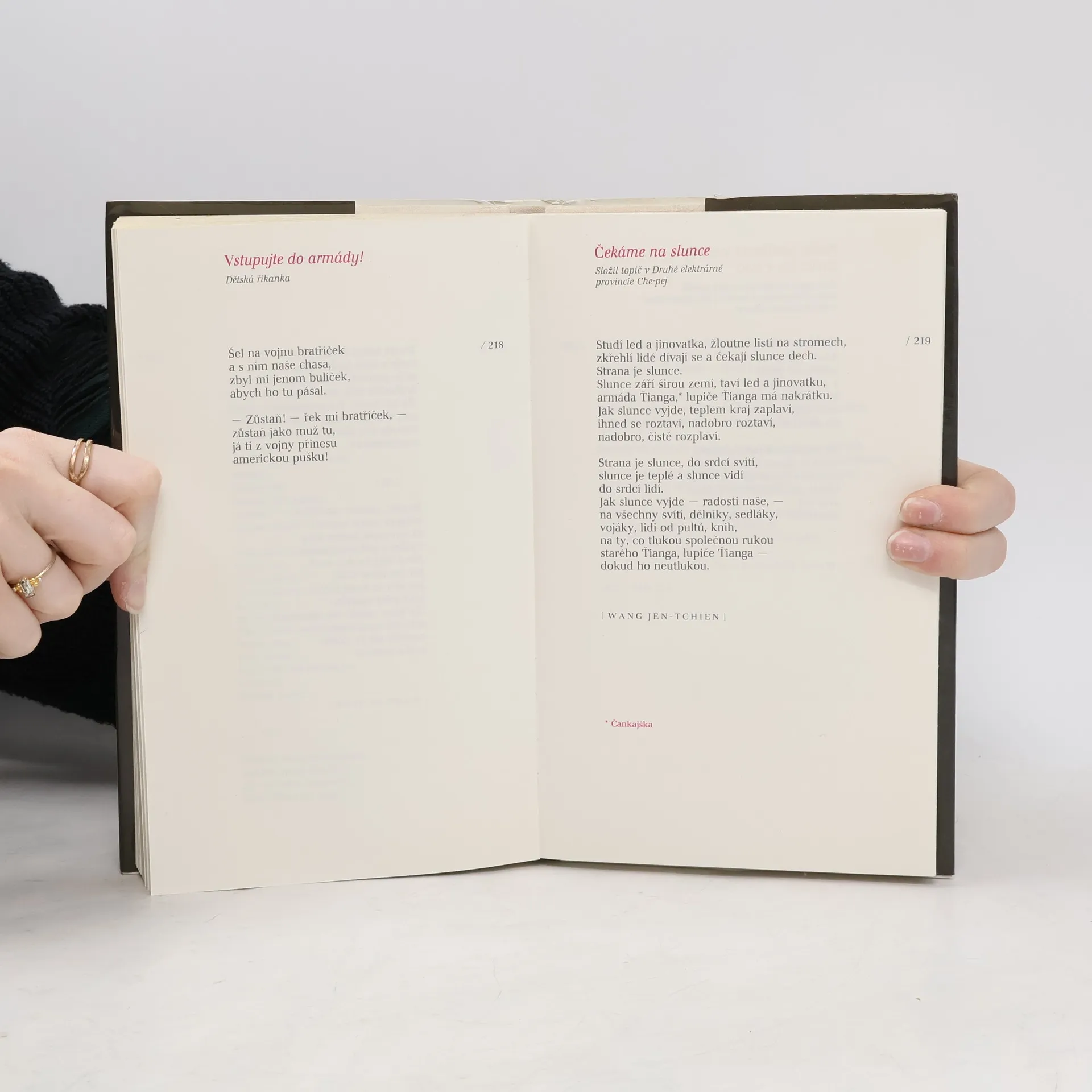 Souborné vydání tří knih parafrází a překladů staré čínské poezie, zachycující vývoj od jejích počátků v 10.-7. stol. před n. l. až po 13. stol. n. l. Verše a doprovodné citace vybral, uspořádal a textově připravil, předmluvu, doslov a ediční poznámky napsal a bibliografii sestavil Jiří Franěk. Výběrová řada Klubu přátel poezie.