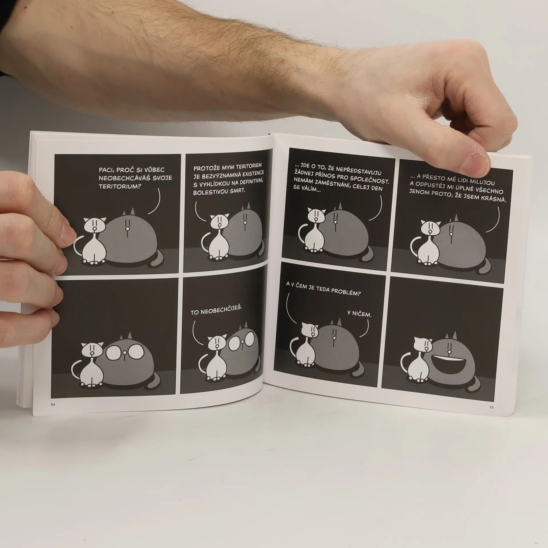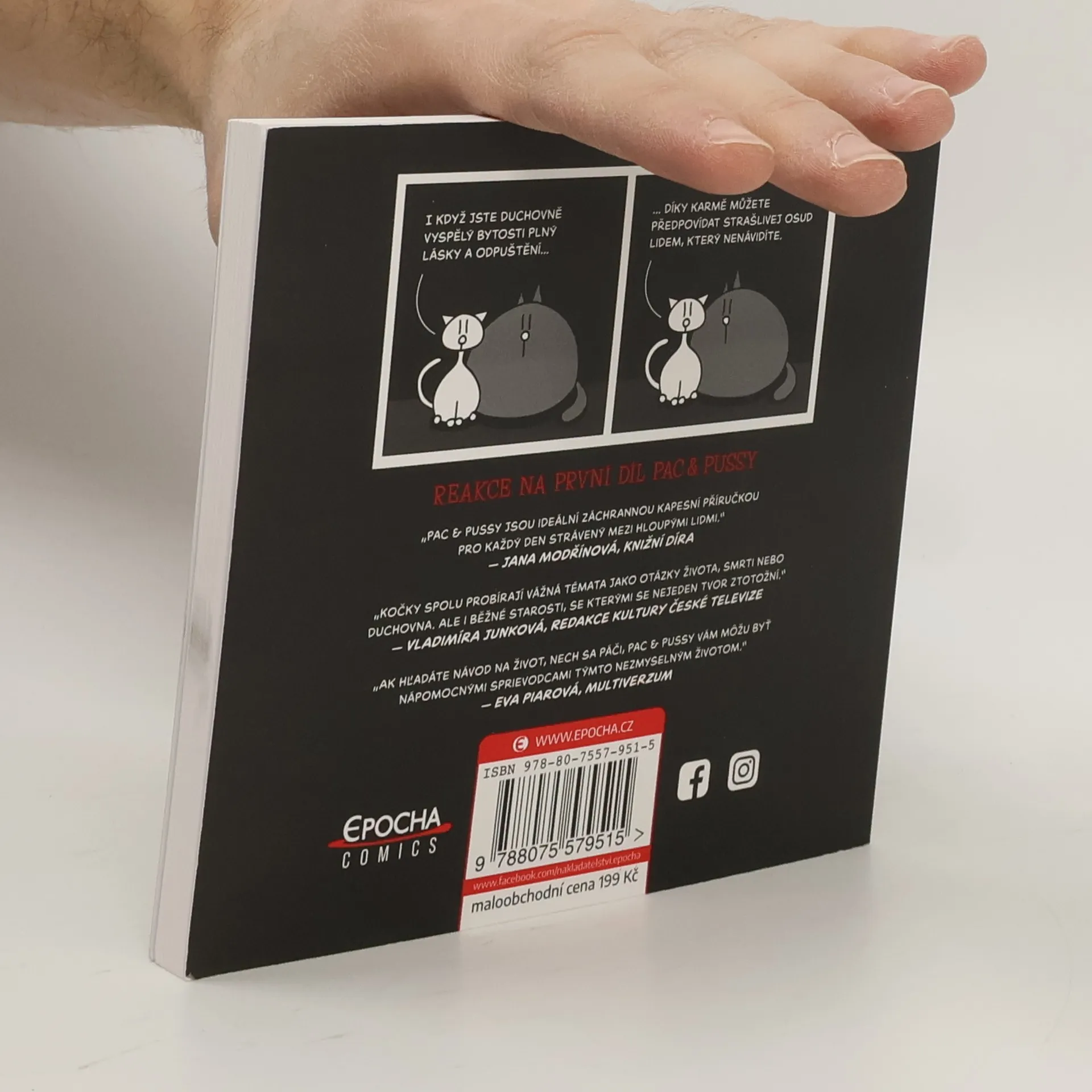 Kočičí sága pokračuje. Pac a Pussy si povolali na pomoc Jednonohýho Peta a také nasadili největší kalibr – barevné stránky a hromadu stripů, které nikdy nevyšly na Facebooku. Zkrátka a dobře, proti optimismu a potírání reality můžete bojovat jenom s depresivními kočičkami, které ví, že jediný smysl vaší existence spočívá v tom, aby měly plnou misku a abyste si koupili tuhle knihu. Druhý svazek sbírky sebraných stripů Pac & Pussy, které se během posledních let staly fenoménem sociálních sítí a nasbíraly desítky tisíc sdílení mezi mnoha tisíci fanoušků fascinovaných svébytným humorem jejich autora.