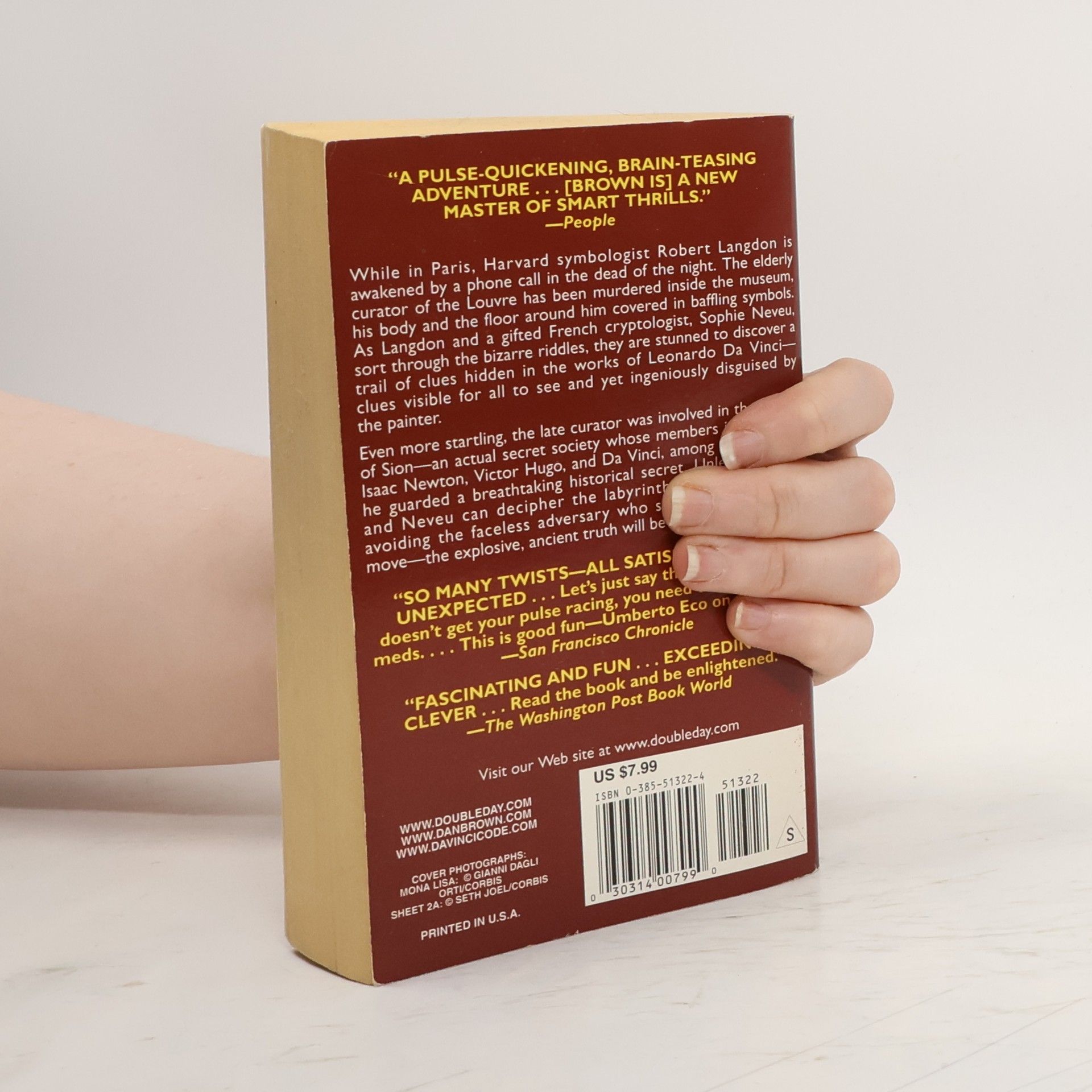 While in Paris, Harvard symbologist Robert Langdon is awakened by a phone call in the dead of the night. The elderly curator of the Louvre has been murdered inside the museum, his body and the floor around him covered in baffling symbols. As Langdon and a gifted French cryptologist, Sophie Neveu, sort through the bizarre riddles, they are stunned to discover a trail of clues hidden in the works of Leonardo Da Vinci -- clues visible for all to see and yet ingeniously disguised by the painter. Even more startling, the late curator was involved in the Priory of Sion -- an actual secret society whose members included Sir Isaac Newton, Victor Hugo, and Da Vinci, among others -- and he guarded a breathtaking historical secret. Unless Langdon and Neveu can decipher the labyrinthine puzzle -- while avoiding the faceless adversary who shadows their every move -- the explosive, ancient truth will be lost forever. (back cover)