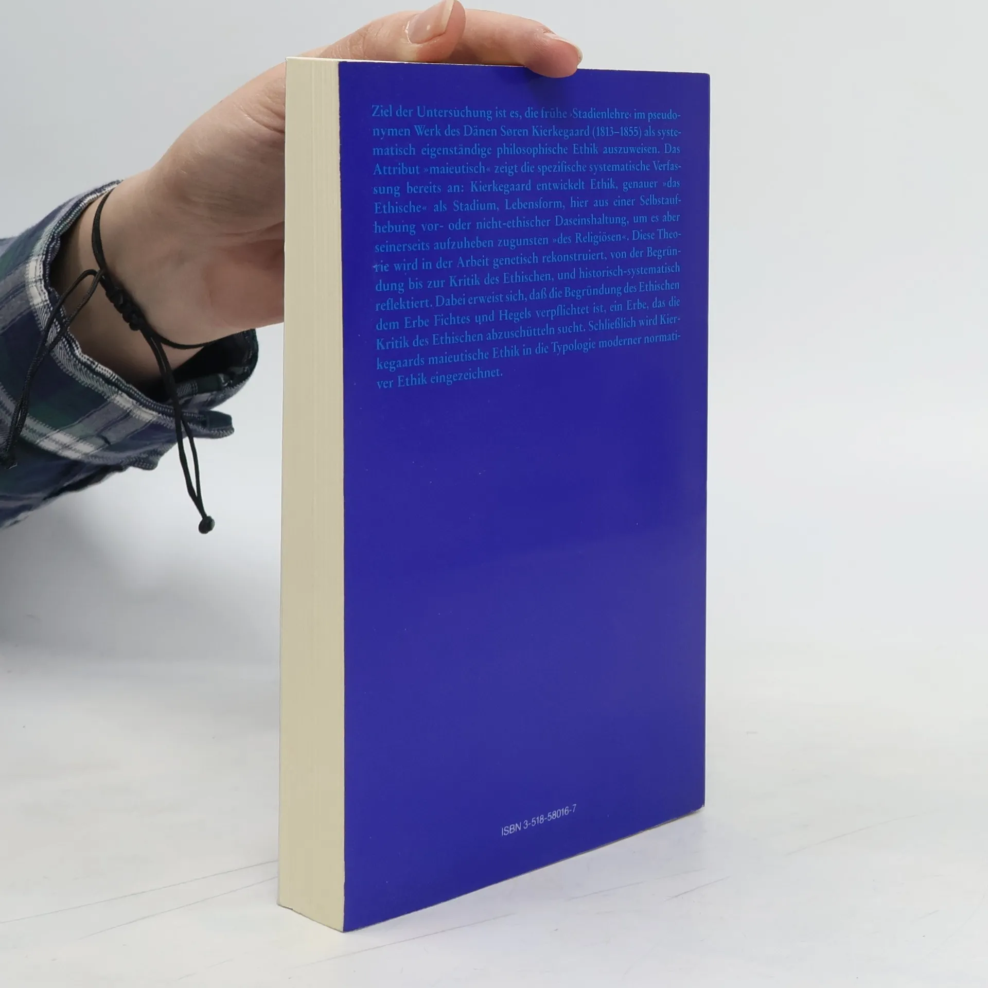 Ziel der Untersuchung ist es, die frühe ›Stadienlehre‹ im pseudonymen Werk des Dänen Søren Kierkegaard (1813-1855) als systematisch eigenständige philosophische Ethik auszuweisen. Das Attribut »meieutisch« zeigt die spezifische systematische Verfassung bereits an: Kierkegaard entwickelt Ethik, genauer »das Ethische« als Stadium, Lebensform, hier aus einer Selbstaufhebung vor- oder nicht-ethische Daseinshaltung, um es aber seinerseits aufzuheben zugunsten des »Religiösen«. Diese Theorie wird in der Arbeit genetisch rekonstruiert, von der Begründung bis zur Kritik des Ethischen, und historisch-systematisch reflektiert.