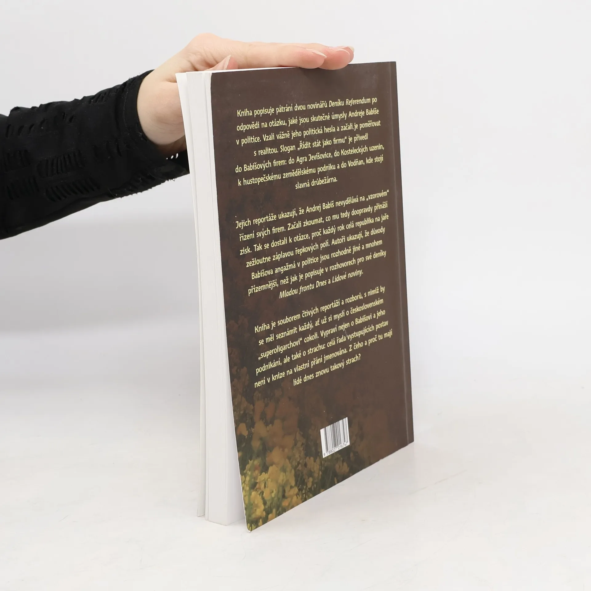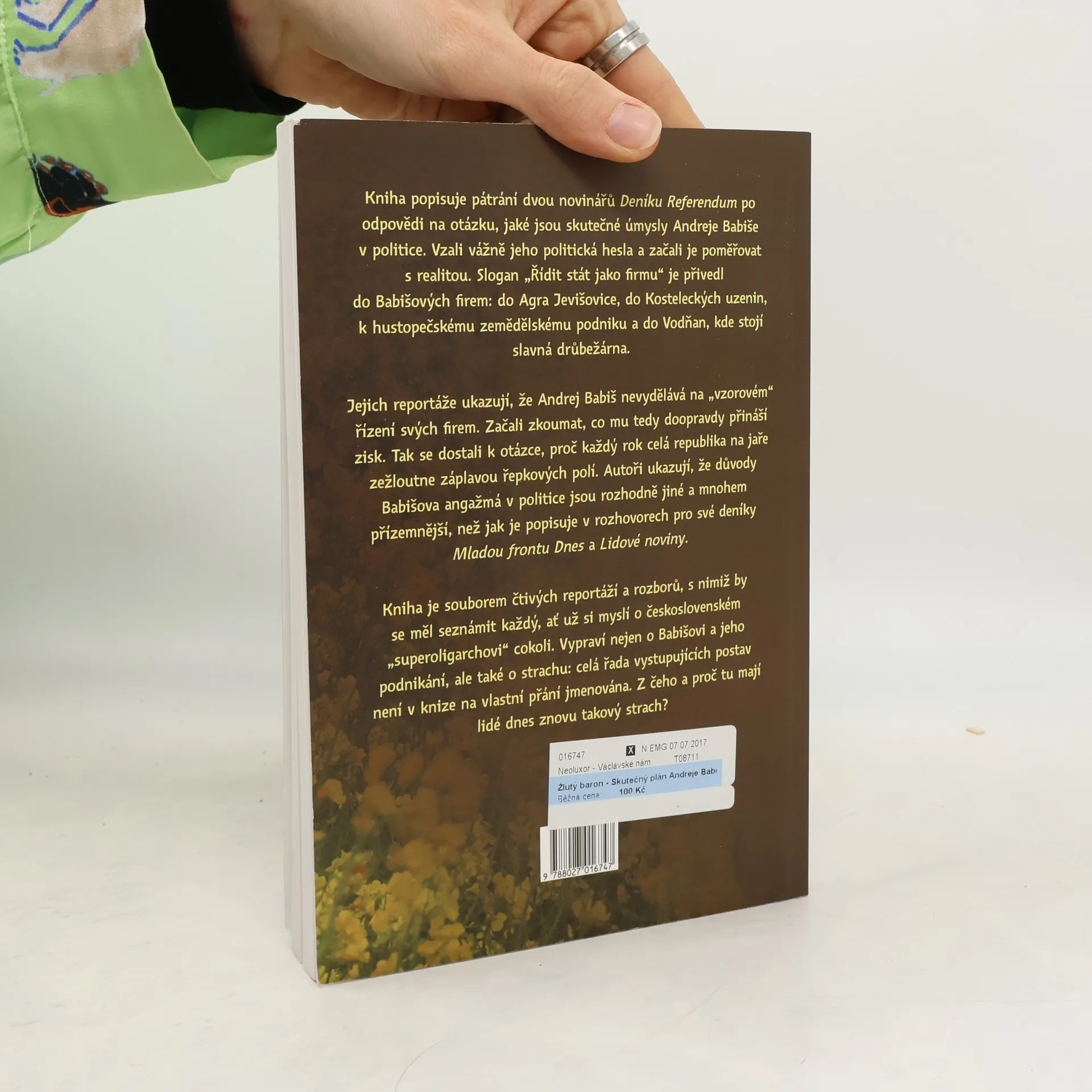 Kniha Žlutý baron vypráví příběh pátrání dvou novinářů Deníku Referendum, Zuzany Vlasaté a Jakuba Patočky, po odpovědi na otázku, jaké jsou skutečné úmysly Andreje Babiše v politice. Vzali vážně jeho politická hesla a začali je poměřovat s realitou. Slogan „Řídit stát jako firmu“ je přivedl do Babišových firem: do Agra Jevišovice, do Kosteleckých…