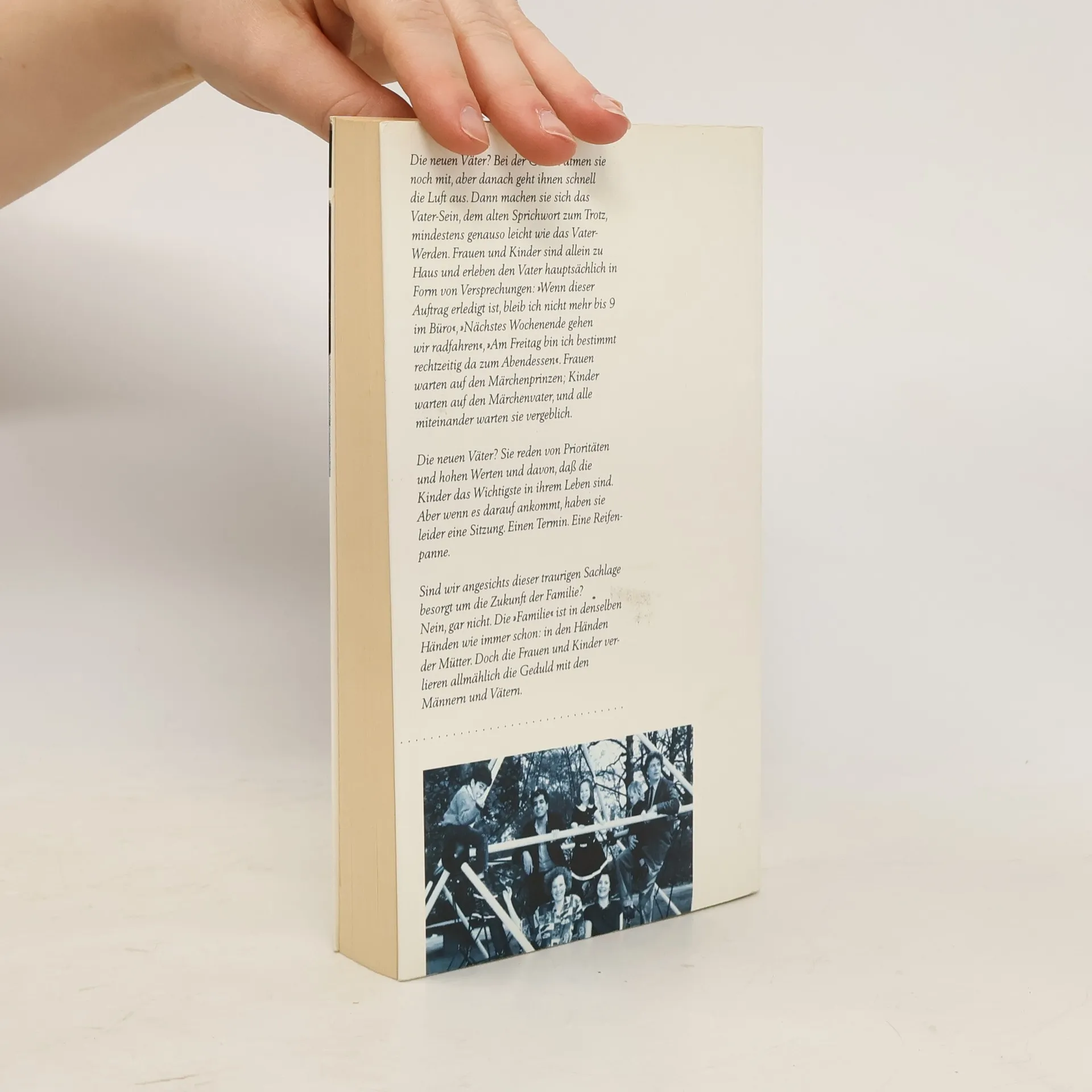 Die neuen Väter? Bei der Geburt atmen sie noch mit, aber danach geht ihnen schnell die Luft aus. Dann machen sie sich das Vater-Sein mindestens genauso leicht wie das Vater-Werden. Frauen und Kinder sind allein zu Haus und erleben den Vater hauptsächlich in Form von «Wenn dieser Auftrag erledigt ist, bleibe ich nicht mehr bis neun im Büro ...». Sie reden davon, daß die Kinder das wichtigste in ihrem Leben sind. Aber wenn es darauf ankommt, haben sie leider eine Sitzung oder eine Reifenpanne. Sind wir angesichts dieser traurigen Sachlage besorgt um die Zukunft der Familie? Nein. «Die Familie» ist in denselben Händen wie schon in den Händen der Mütter. Doch die Frauen und Kinder verlieren allmählich die Geduld mit den Männern und Vätern.